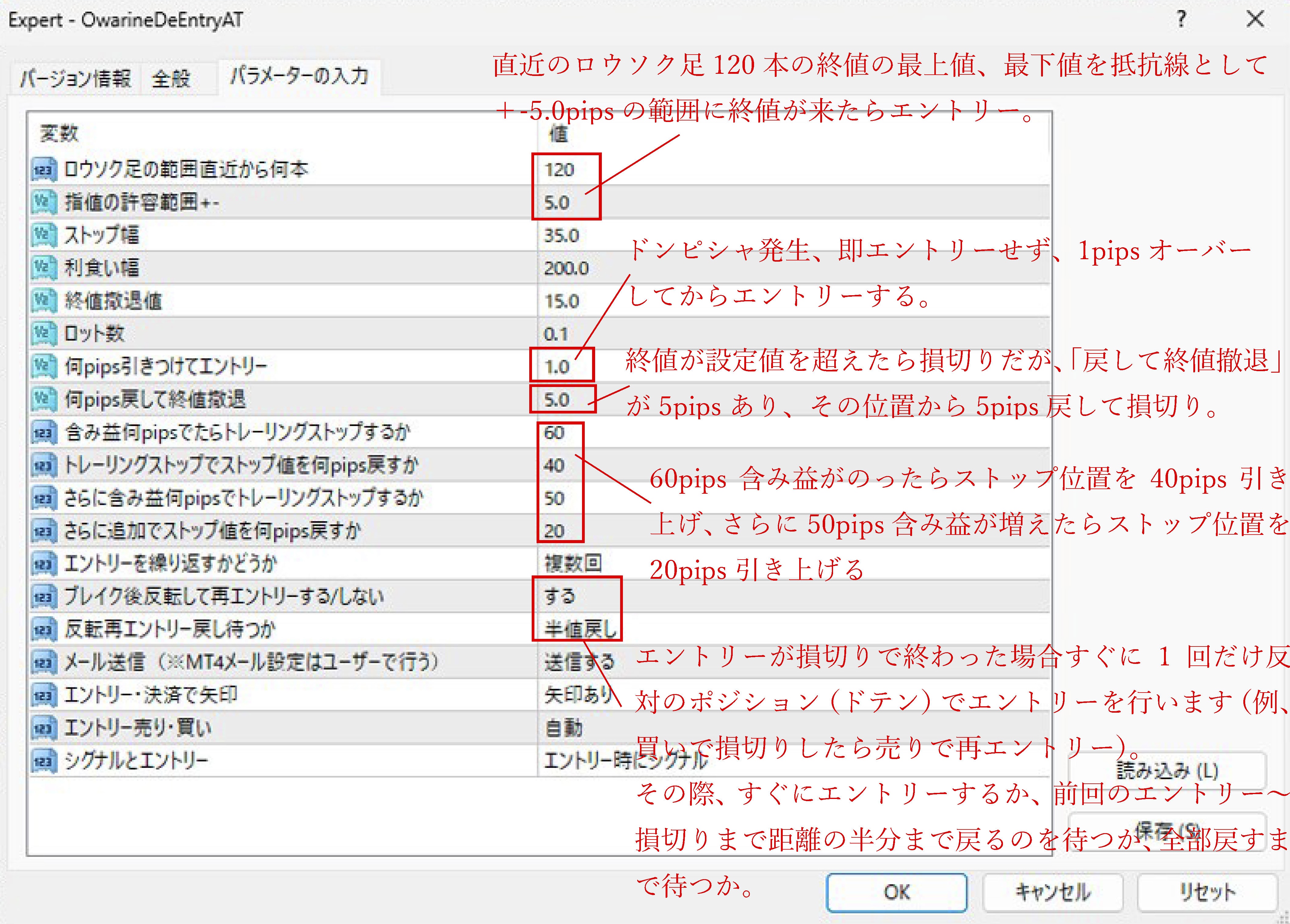抵抗線を判定するロウソク足の範囲を設定、利食い幅、損切り幅、終値撤退などの値などを設定したら、あとはEAが自動的にエントリーします。