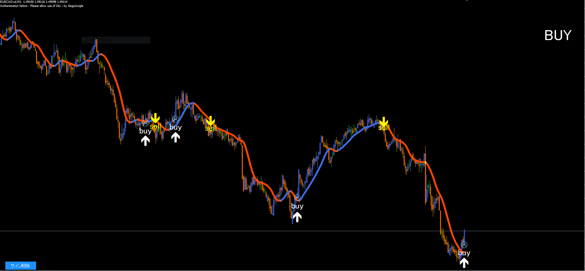 画面右上には最後に出た矢印の方向(トレンド方向)がbuy/sellで表示されます。↓