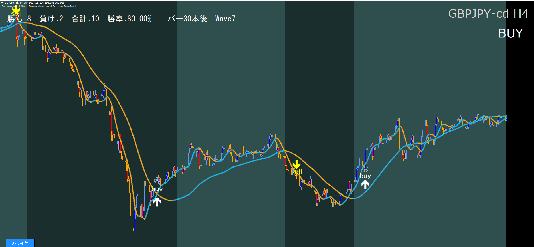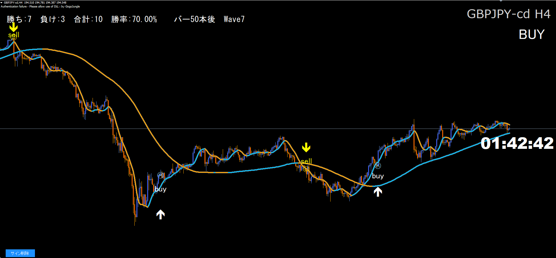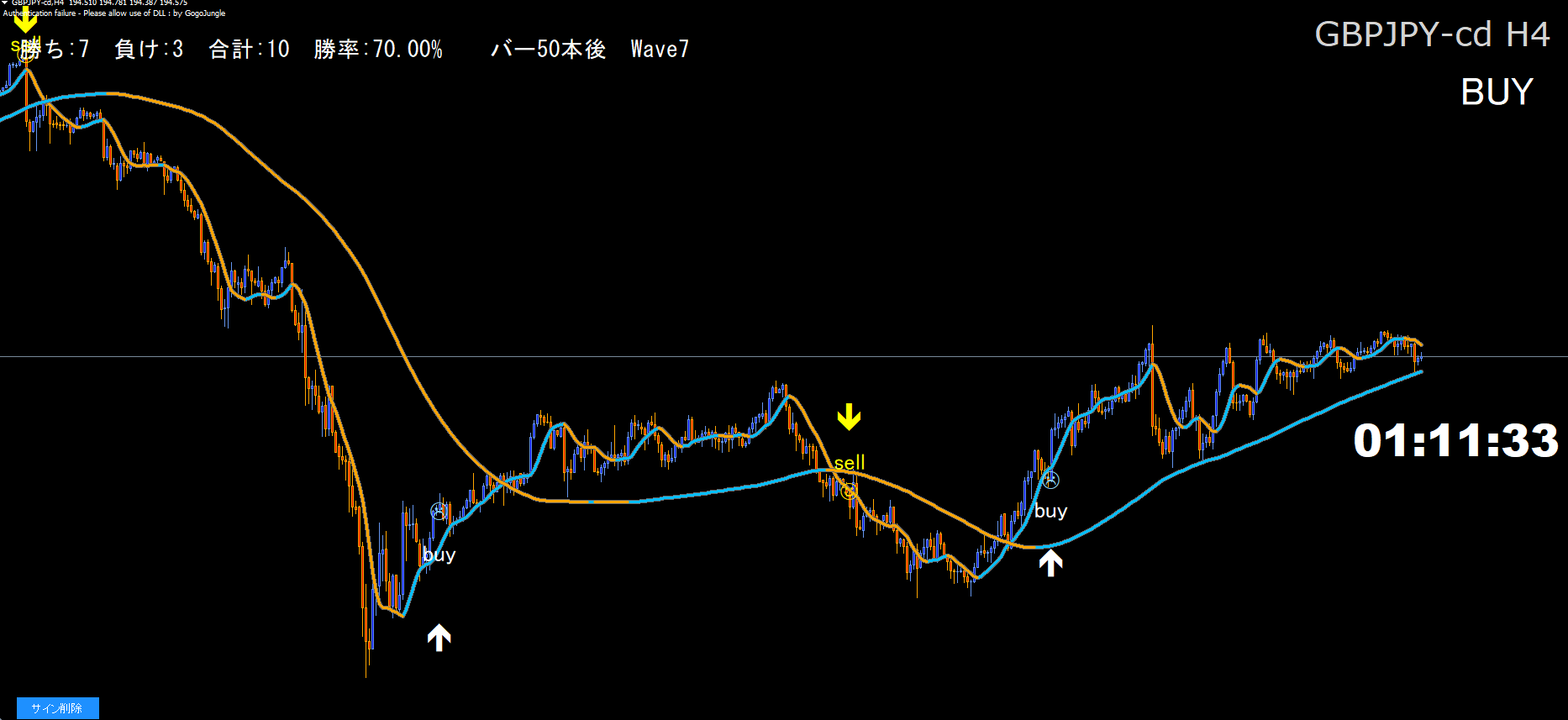 4時間足にもフィット。ローソク足50本後の勝率が70%なら、サイン通りの売買で勝てそう。