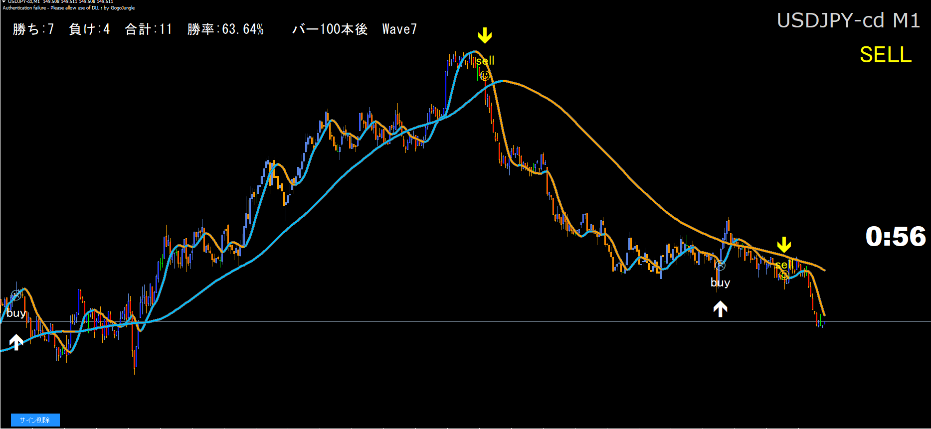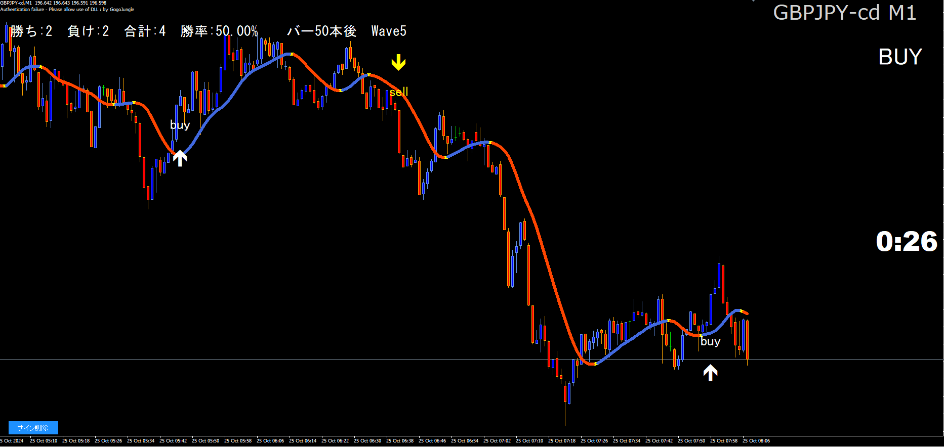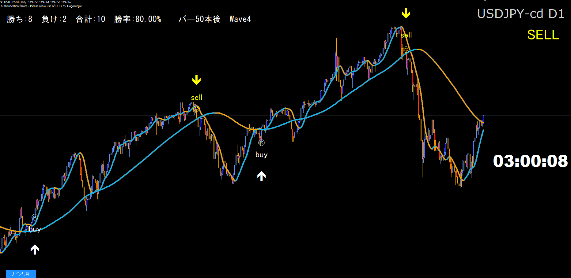 4時間足にもフィット。ローソク足50本後の勝率が70%なら、サイン通りの売買で勝てそう。