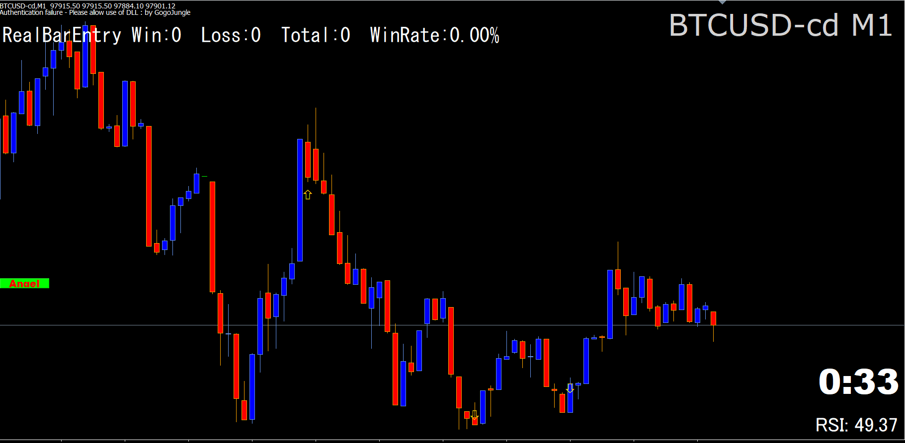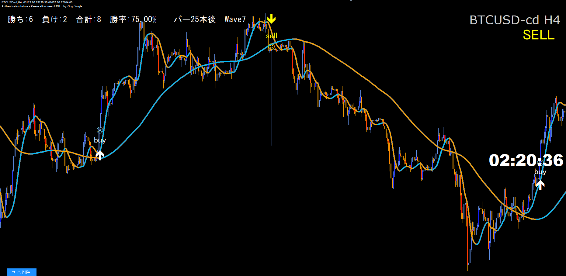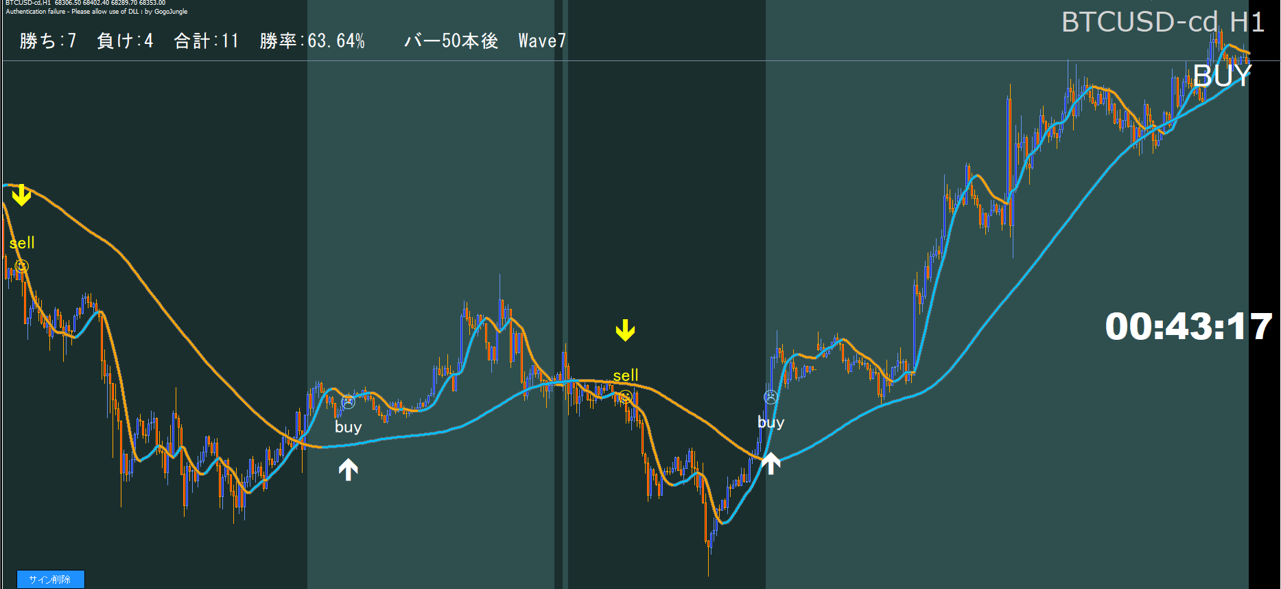 逆張りトレーダー用に機能追加した矢印転換機能を使って、特別に勝率が低い通貨ペアと時間足の組み合わせを使って、逆張りエントリーもできます。ただし、逆張りの場合は、次のローソク足の始値でエントリーしてください。