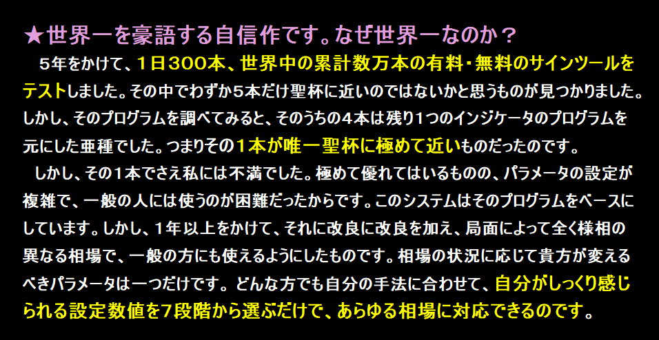 良いツールというのは、良いヒントを与えて、10回に1回の可能性を3回に1回、2回に1回という風に確率を高めてくれるのです。逆行したら、さっさと損切するというルールを確実に守ってください。それができるようになれば、勝利は間近です。資金管理だなどと難しく考える必要はありません。決めたルールの通りに迷わず損切り・決済できるか、それだけでいいんです。ですからそれのできない方のために自動決済EAを付けています。決済はEAにお任せして、自分はどこでエントリーするのが確率が高いか、それだけに集中してください!