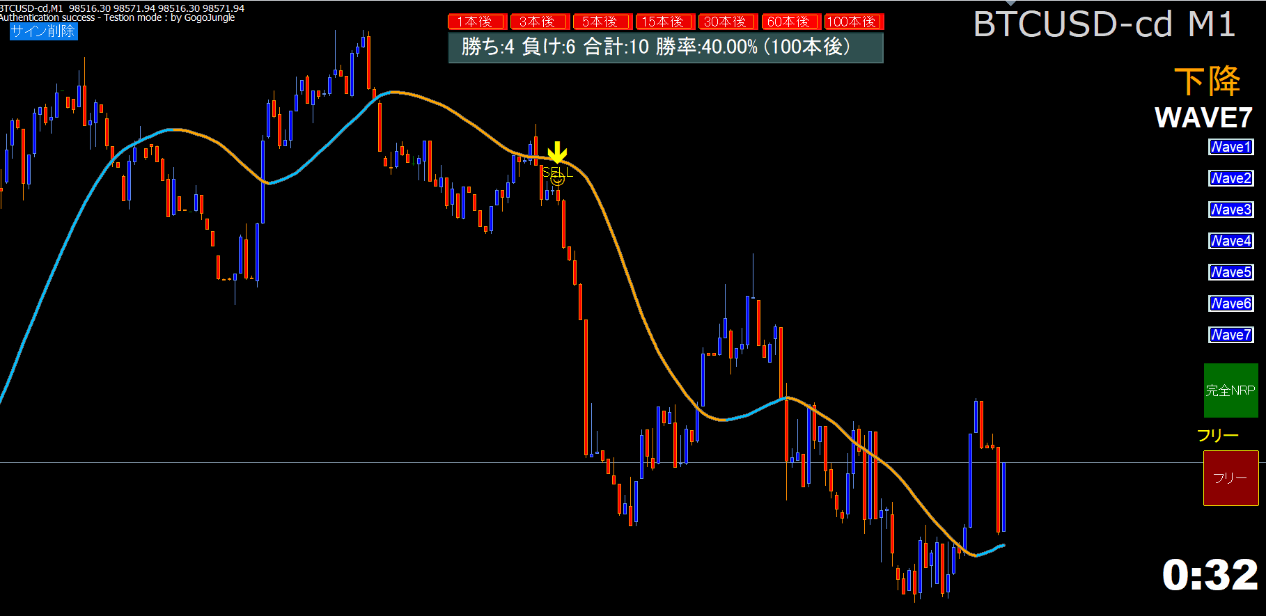 ↑ 画面中央には勝率、右上にはWAVE設定値と共に「上昇」「下降」と表示されます.
