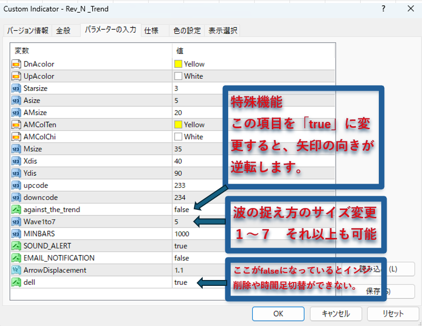 ◎ Rev_N_Trend のパラメータで、dell の項目を、「false」にすると、完全なノーリペイント仕様