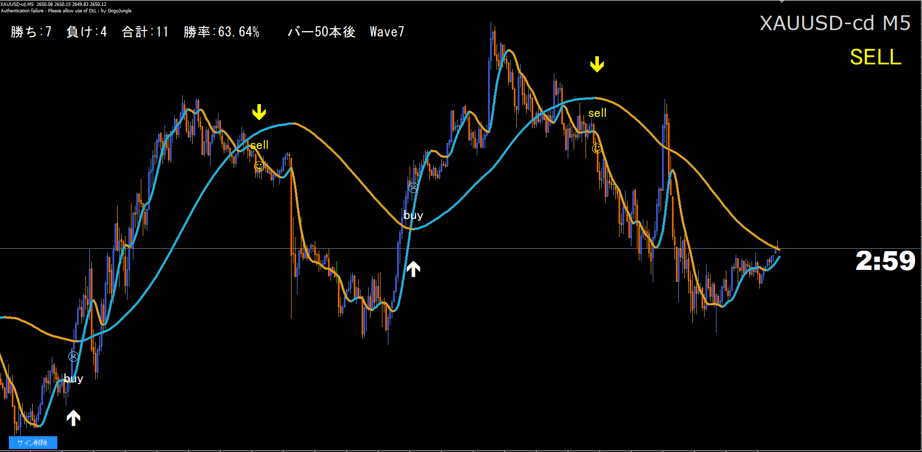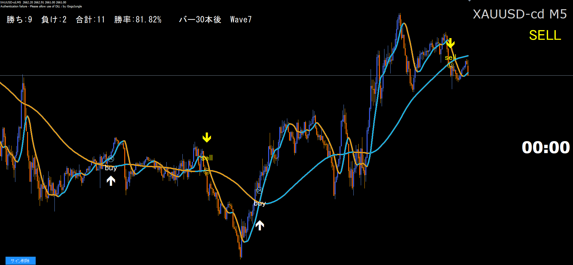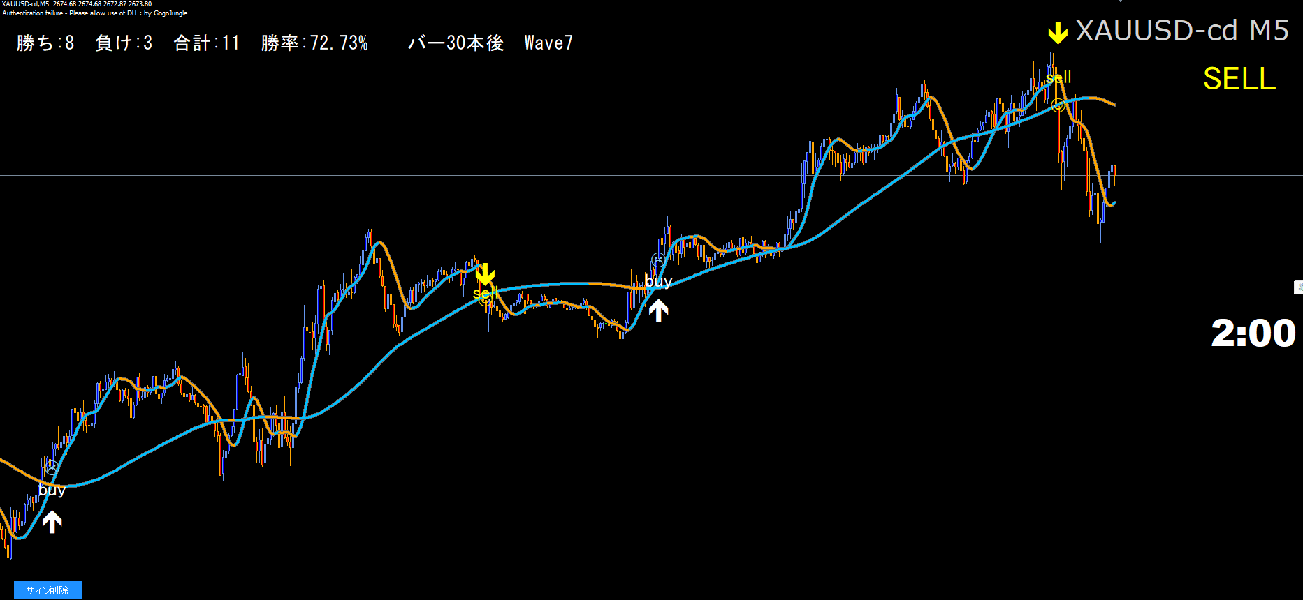 ゴールドにも、5分足にも相性が良いです。この例では、サイン通りのトレードでも勝てそう。