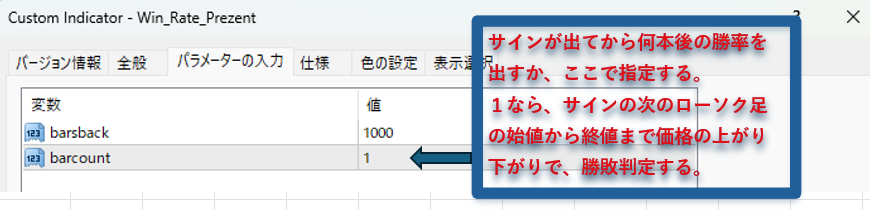 ※1 パラメータ―画面で、ローソク足〇本後の勝率が指定できます。