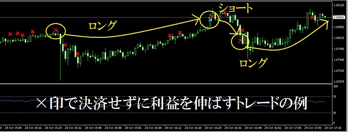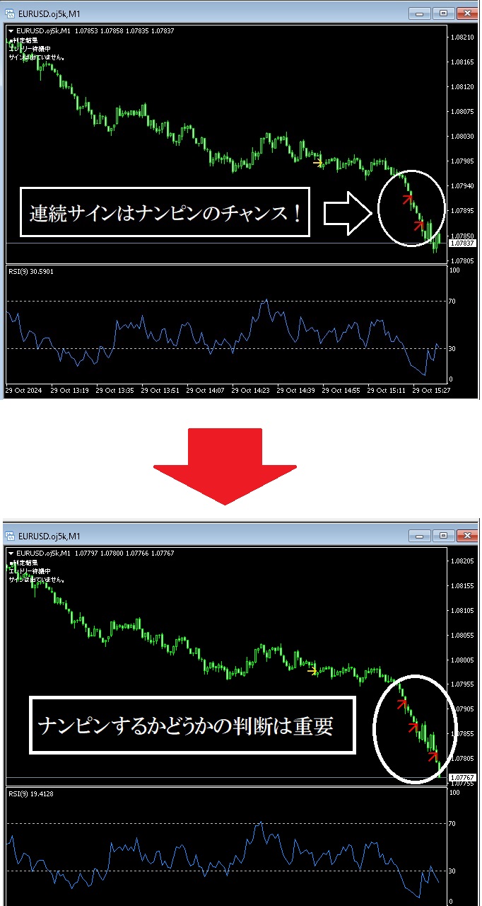 この場合、売買サインに従ってエントリーし続けると、ナンピントレードに発展することがあります。