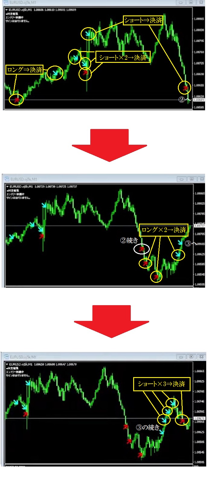 ↑と↓の矢印は、2本前のバーの所に表示されます。(見やすくする為の処理)