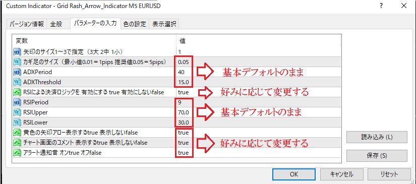 値動きの大きい時間帯(特に欧州・米国市場が活発になる日本時間の夕方から深夜)にサインが出やすい特徴があります。 トレンドの強さを測るため、ADX(平均方向性指数)を使用しています。 ADXの判定期間はローソク足40本分で設定されており(ADXPeriod = 40)、一般的にADXの値が25以上で強いトレンドと見なされますが、このインジケーターではADXThresholdを15に設定しているため、トレンドの初期段階からエントリーを行うことが可能です。 エントリートリガーとなるカギ足ロジックでは、GridSizeをデフォルトで0.05(=5pips)に設定し、トレンドから5pips逆行したタイミングで逆張りでサインが点灯します。 このため、基本的にはトレンド方向と逆方向にサインが出現するカウンタートレンド手法となります。 決済のタイミングにはRSIを用いたフィルターを実装しており、ローソク足が確定した瞬間にRSIが規定値にタッチするとチャート上に×印が表示されます。 具体的には、RSIの上限(Upper)にタッチするとロングポジションを決済し、下限(Lower)にタッチするとショートポジションを決済します。 決済サインが出ても即座にポジションをクローズする必要はなく、決済を遅らせることで利益を伸ばすことが可能です。