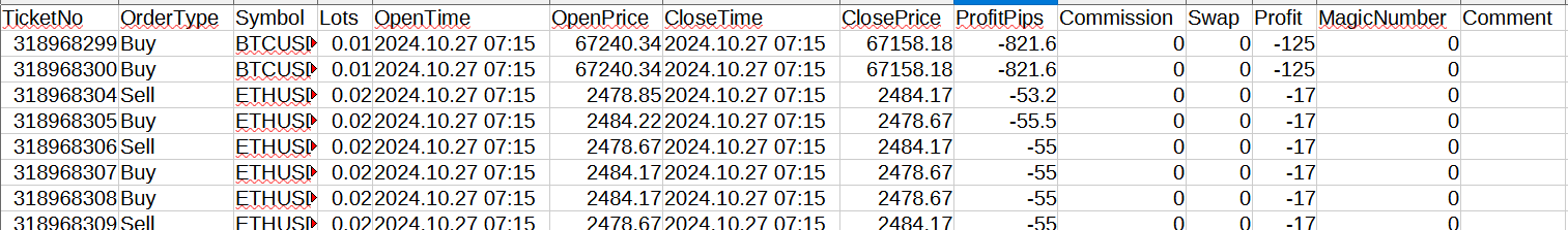 No、買い売りの種別、通貨ペア、ロット数、エントリー価格、エントリー時間、クローズ時間、クローズ価格、利益(pips)、手数料、スワップポイント、マジックナンバー、コメント