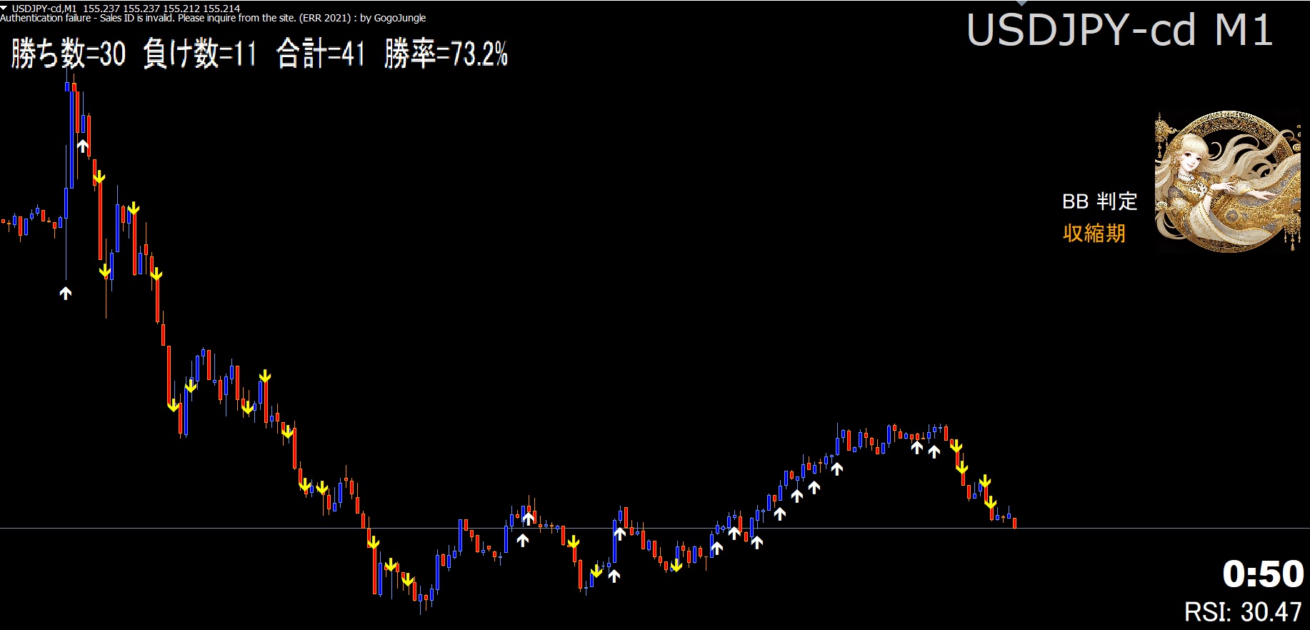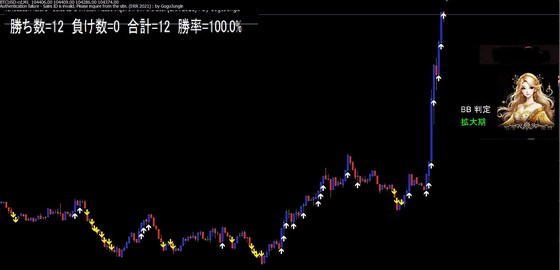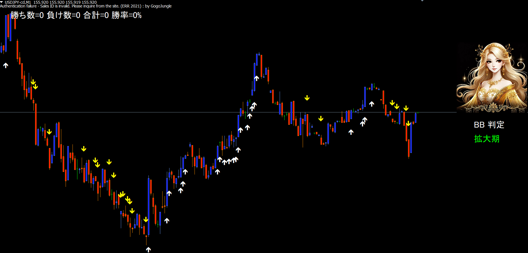 このインジケータで、勝率も女神画像の表示も合わせて行います。女神画像と共に収縮期と表示される場合は、トレードには適しません。拡大期と表示されているトレンドが発生している状態のチャートで取引してください。