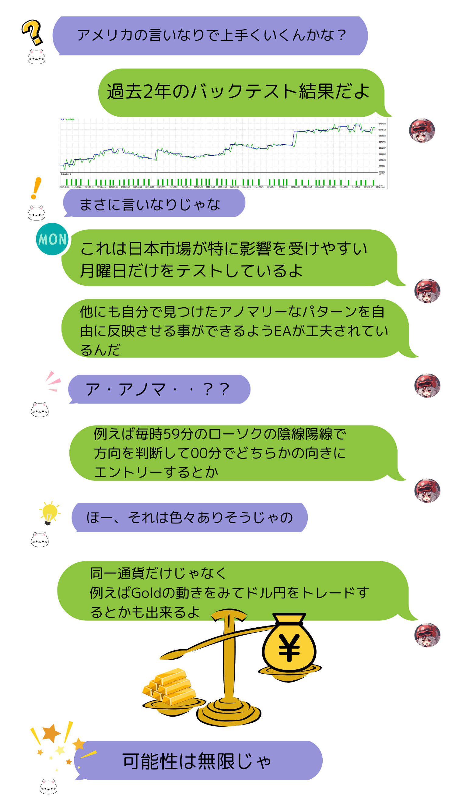このロジックは、アメリカ市場の動向とドルの強弱に基づいたトレード戦略です。市場の動きを敏感に捉え、計画的にポジションを取ることで、リスクを最小限に抑えながら利益を狙うことが可能になります。