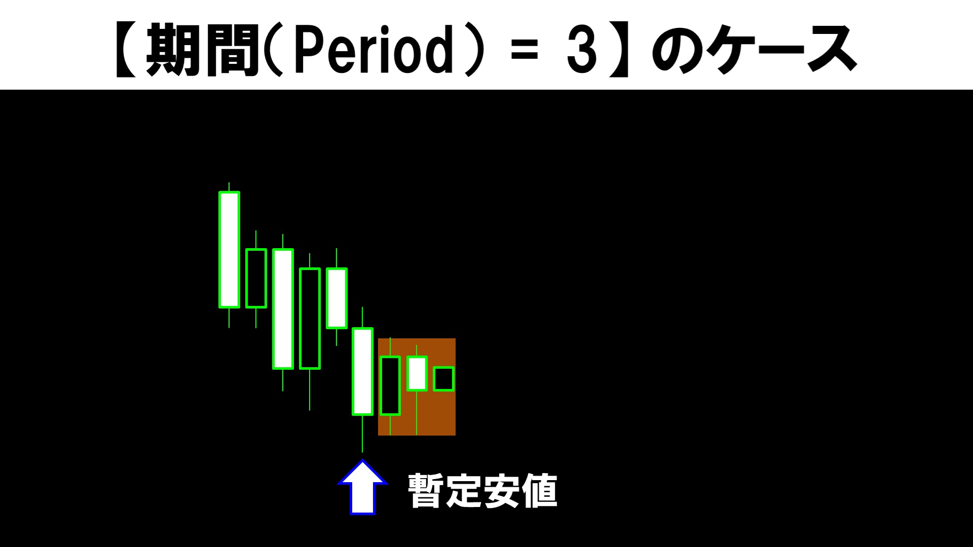 Periodで指定した本数分のローソク足の中で安値を更新すると暫定安値が生まれます。この図では4本前が暫定安値になっていますが、これが更新されたり確定安値になる条件をこれから説明します。また、この暫定安値である白抜き矢印はチャートに表示されません。何故なら初心者がこれをシグナルと間違えて「ここでエントリーしろって事だな!」とやってしまう恐れがあるからです。