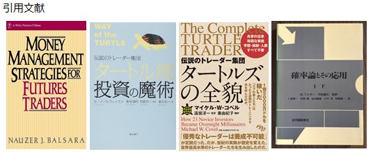 1.Money management strategies for futures traders Nauzer J. Balsara 著 2.タートル流投資の魔術 カーティス.フェイス著 3.タートルズの全貌 マイケル.W.コペル著 4.確率論とその応用 I 下 W.フェラー著