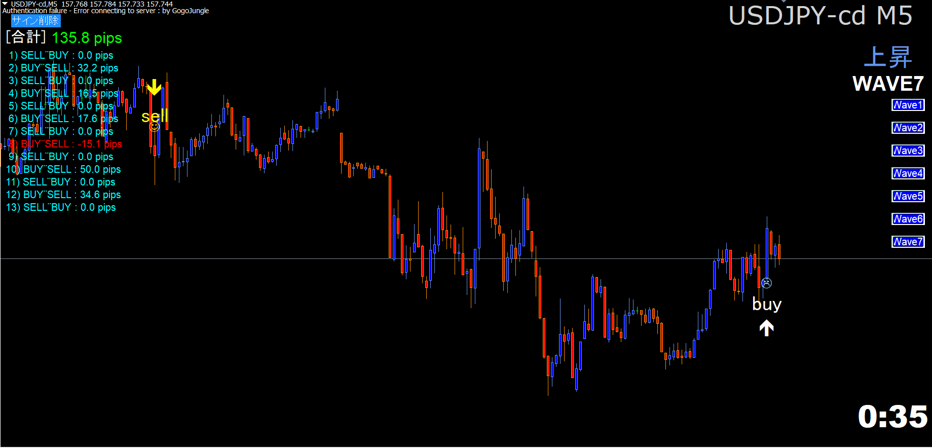 ◎ WAVE値 設定値1の例(波の捉え方が最小で、スキャルピングに最適です。