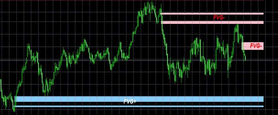 フェアバリューギャップ(FVG)は、市場の流動性の一方が提供される価格範囲であり、通常は同じ価格範囲の低時間足チャートで流動性の空白によって確認されます。