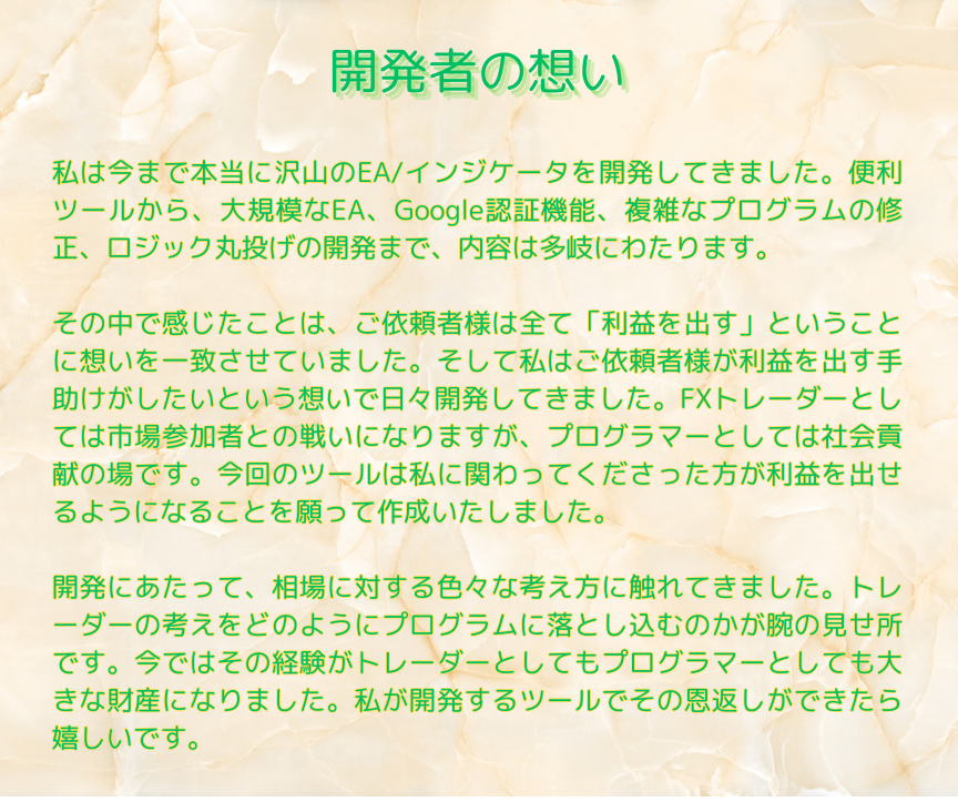 当ツールは試行錯誤のスピードを上げトレーダーとして利益を出す手助けをするものです。実を言えば、サインツールを使い込んでいくうちに、色々なトレーディングアイデアが浮かんできて、それを試していくうちに知識や相場観が身に付き、利益を上げた方をたくさん見てきました。なにより私もその一人です。開発者として様々なツールを作ると、他のトレーダーに比べて試行錯誤の回数が格段に多く、その恩恵を受けてきた実感があります。全トレーダーがプログラミングを一から学ぶのは大変ですから、当ツールを最大限に活用し、自由な発想でサインを組み合わせ勝てるツールを手に入れてください!