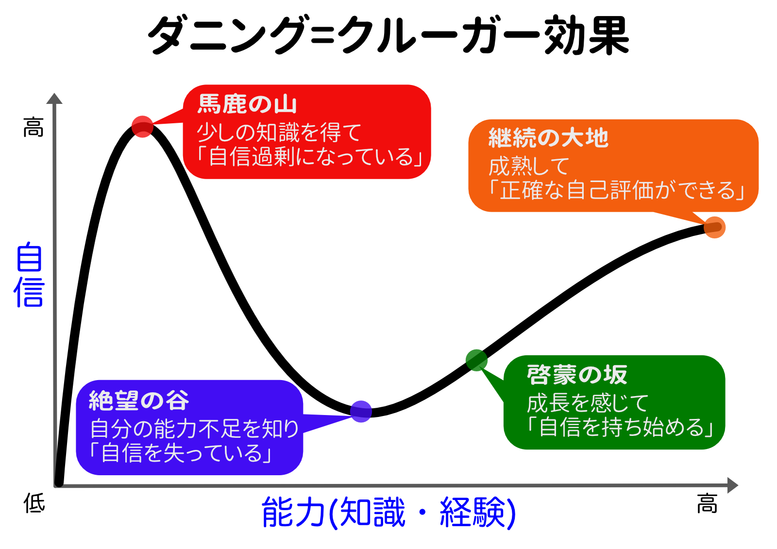 ダニング=クルーガー効果とは、自分の能力を正しく認識できず過大評価してしまう心理現象のことです。自信と能力は単純に比例せず、少しの能力を得た段階で過大な自己評価を行います。トレードの怖いところは、偶然に利益を獲得したときに自信過剰になりロットを上げて証拠金を一度に失う可能性があることです。