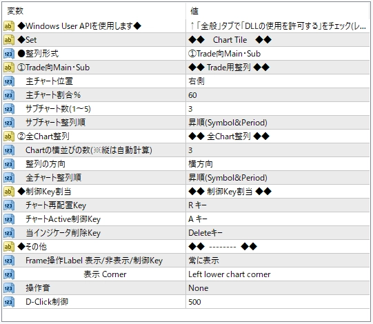👈プルダウン項目「●整列形式」で①Trade向Main・Sub/②全チャート整列を選択し、以下それぞれの該当項目を指示します