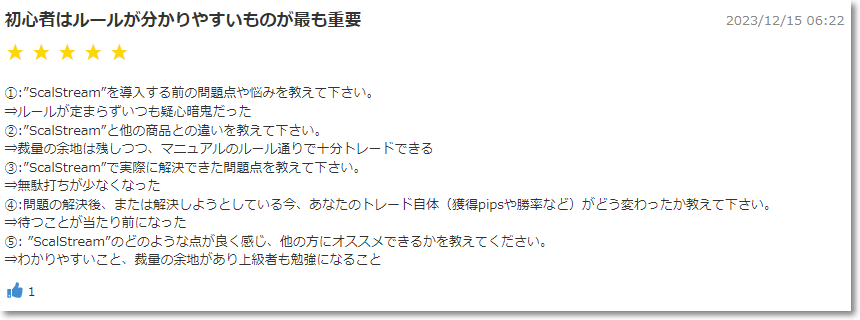 上記、「⇒」の後に簡単で構いませんのでそれぞれご解答を頂き、「--------」の点線内をコピペし、そのままScalStream”商品レビューへご投稿をお願い致します。