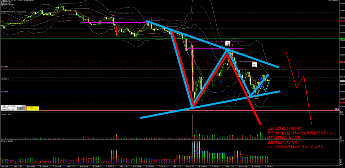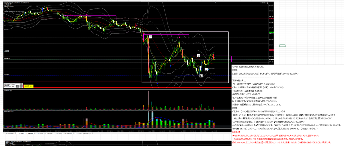 引いたゾーンに戻ってエントリーできるのが、70%ぐらいある感覚です。一発目で勝てるのは40%ぐらい?やはりDAIさんのおっしゃってた通り二発、三発目では高確率で勝てる。1番役に立ったのは、ゾーンの引き方で、ゾーンのてっぺんから反発して行った時は、これを教材にしたDAIさんは本当に天才だと改めて感じる。