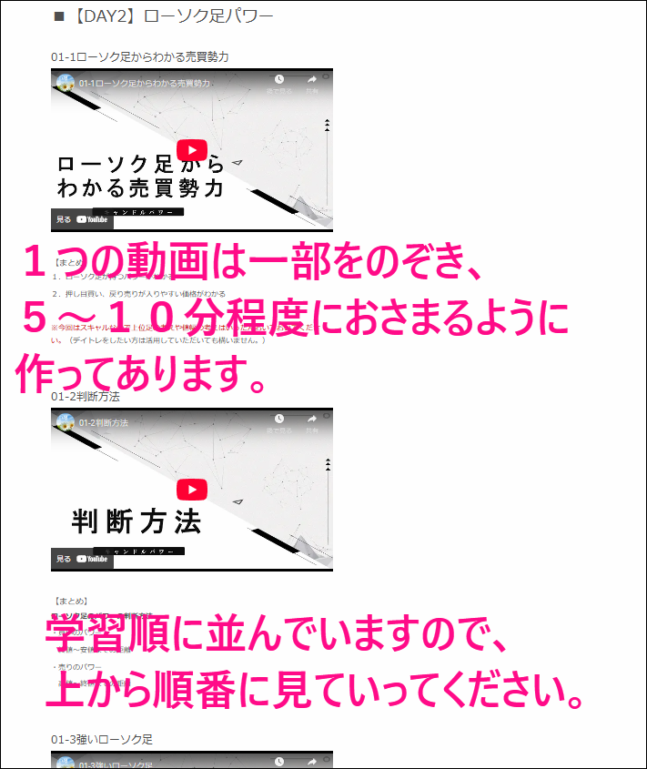 12日間でひととおり学べるようになっています。必ず12日間で行う必要はありませんので、自分のペースで進めてください。学び終わった後は、練習や検証を引き続き行い、実践トレードへとうつっていってください。わからないことはコミュニティでご質問ください。