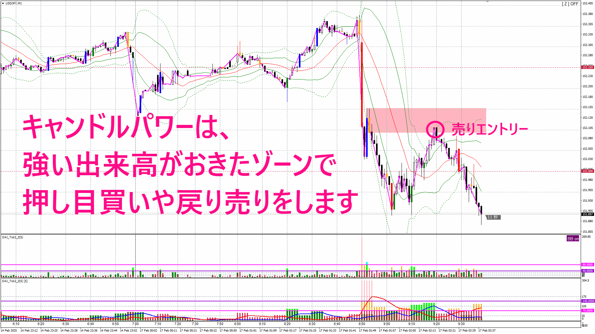 Q.ドル円、GOLD以外は使えませんか? A.検証したことがないのでわかりません。理由はドル円のみでも十分トレードできており他の通貨ペアをさわる理由がないからです。もしかしたらできる通貨ペアもあるかもしれませんが、やったことがないのでなんともいえません。誰か検証してくれると助かります。基本的にはスプレッドの小さいメジャー通貨ペアをおすすめします。スキャルOKの業者でトレードしてください。 Q.インジケーターはどれくらい使いますか? A.最終的にはローソク足だけでもトレードできるようになってほしいと思います。私自身はインジを表示しているものの、あくまで参考程度です。ただ初心者などは大きな出来高の判断が難しいと思いますのでサブウインドウの買いパワーや売りパワー、メインウインドウのローソク足の連続性など目安にするとよいと思います。