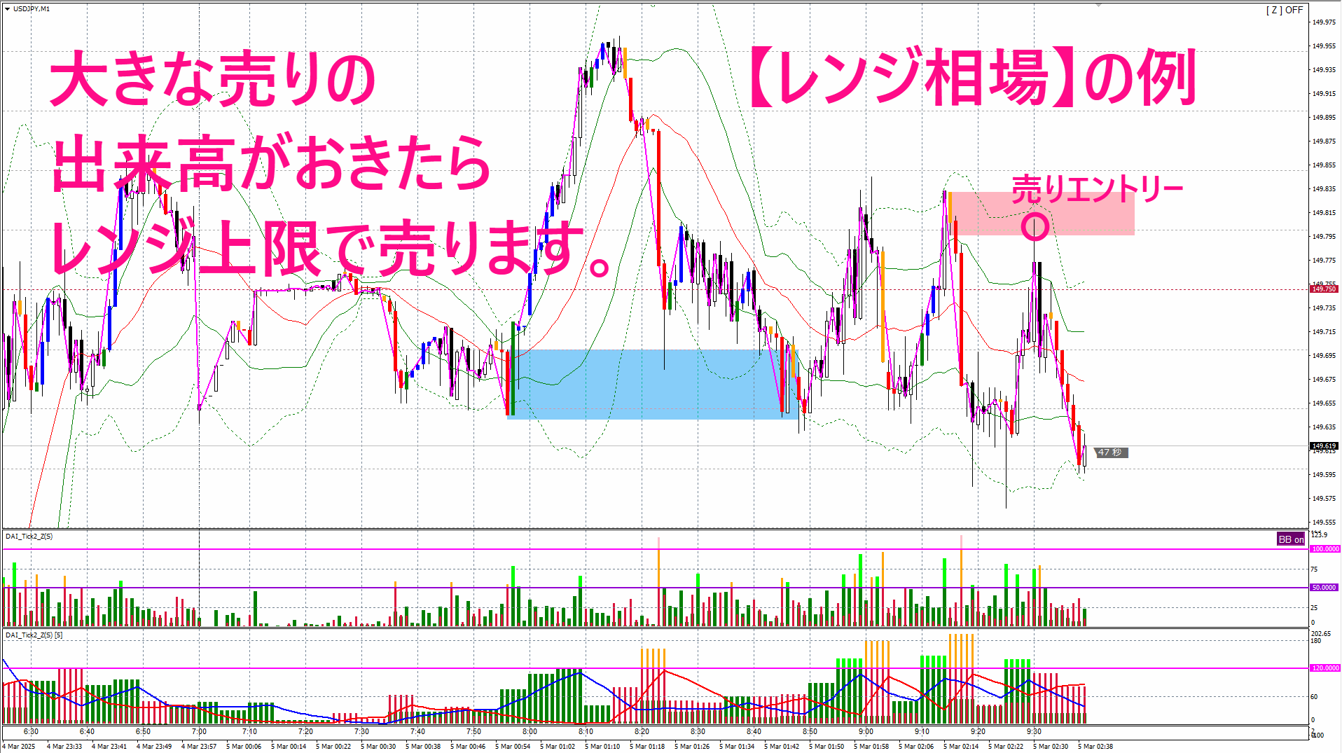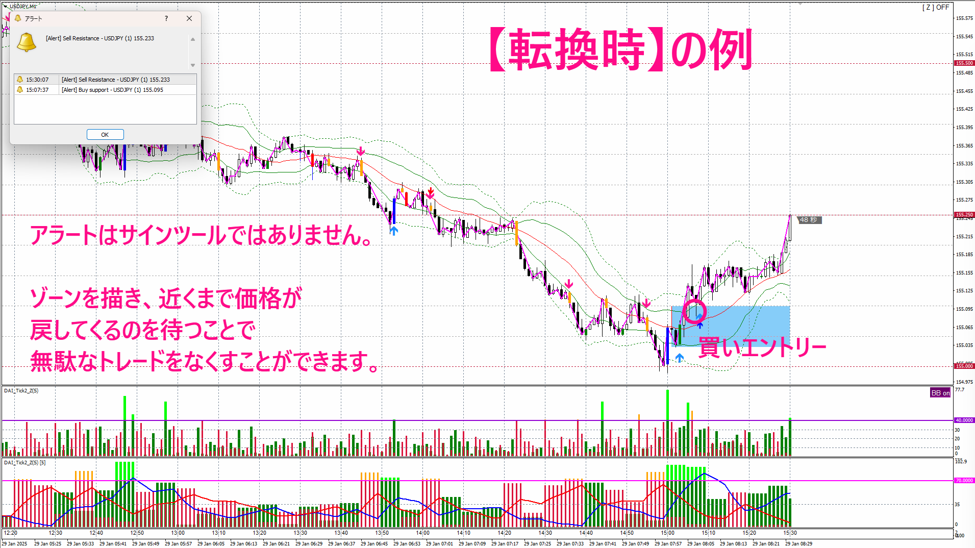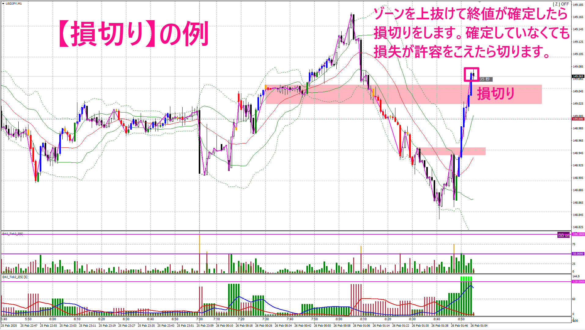 今回はスキャルピングなので動画にあったような長期足のゾーンは使いません。おまけで長期足のゾーンインジはつけていますのでデイトレをしたい方は参考にしてもらっても構いません。ただし、メインは1分足のみを用いたスキャルです。一般的な上位足を見て押し目買いや戻り売りをする方法ではありませんのでご注意ください。