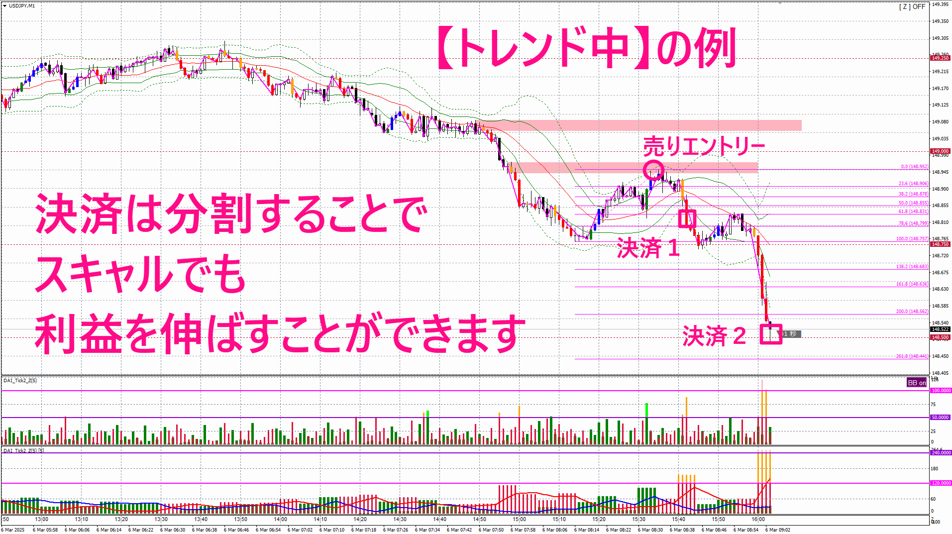 スキャルなので、逆行する前に分割決済します。確実に利益を残し、残りを伸ばします。多くは早めに決済しますが、何回かに1回は伸びるときがあります。