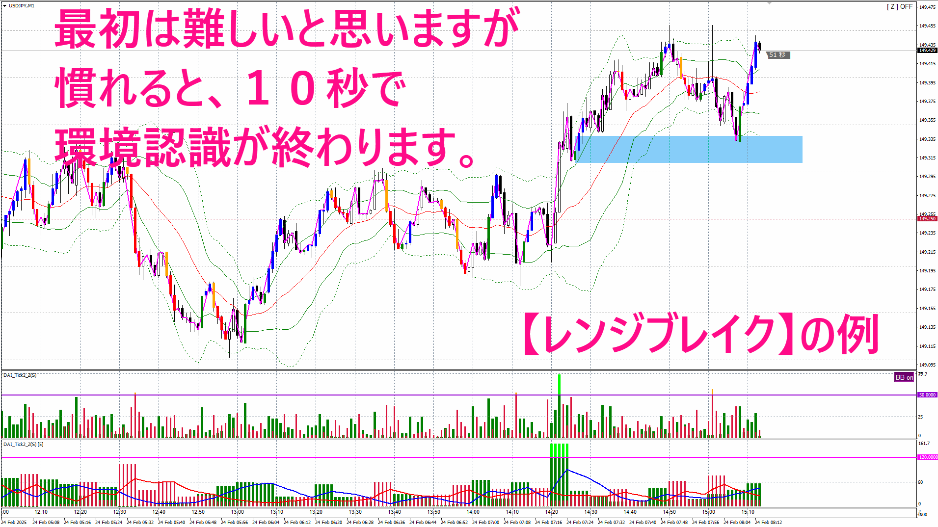 Q.エントリーや決済は手動ですか?EAは使えませんか? A.エントリー、決済、損切りは手動です。利益を伸ばすときや建値で切るときはあらかじめ注文を出しておくこともできます。分割エントリーで複数のポジションを持つことがありますので一括決済できるEAがあると便利です。スキャルピングは決済までがはやいこともあるため自動決済EAは用いていません。 Q.1回のトレード時間はどれくらいですか? A.数分から5~10分くらいが多いと思います。分割決済で伸ばしても1時間以内に終わることが多いと思います。分割決済をするため、途中で半分や一部決済した後は、残りのポジションを指値、逆指値でほったらかすことは可能です。 Q.デイトレードやスイングトレードにも役立ちますか? A.考え方は役立ちます。ですが、相場解説はスキャルがメインですので、考え方は間違いなくおすすめできますが、自力で検証できる必要があります。デイトレやスイング主体の場合は別の教材の方がよいかもしれません。 Q.時間足は1分足のみだそうですが上位足は見ないのですか? A.はい、見ません。1分足のみです。理由は勝率重視だからです。リスクリワード比率と勝率はトレードオフの関係のため値幅を狙うと勝率が下がります。上位足は大きくとりたいときに見ることが多いですので、上位足を見るほど勝率が下がる場合があります。そのためあえて見ず、1分足のみで勝率を高めています。ただし値幅をとりながら勝つ人もいますので、上位足を見た方が良い結果が出る人もいると思います。基本的には見なくてよくて、値幅を狙う場合は見てもよいと思います。 Q.エントリーや決済、損切りは誰でもわかりやすいものですか? A.いいえ。裁量ですので最初はわかりにくいと思います。下記の実践者の声を見ていただければ想像つくかもしれませんが、最初は難しいと思います。決まりはありますが、ゾーンを描くため、難しい相場だと書きにくいことがあります。そのため、練習問題があります。練習や検証を通じて、だんだんわかるようになります。 Q.一回で何pipsくらいとれますか? A.値幅を狙わない場合、数pipsから5pips程度です。分割決済で伸ばすことがありますので、その場合は10pips以上大きくとれることもあります。ドル円の場合です。GOLDなど値動きのある通貨だとボラに応じて利益も大きくなります。ただしトレンドにそって大きくとるような手法ではないため、pips数は期待しないほうがよいと思います。