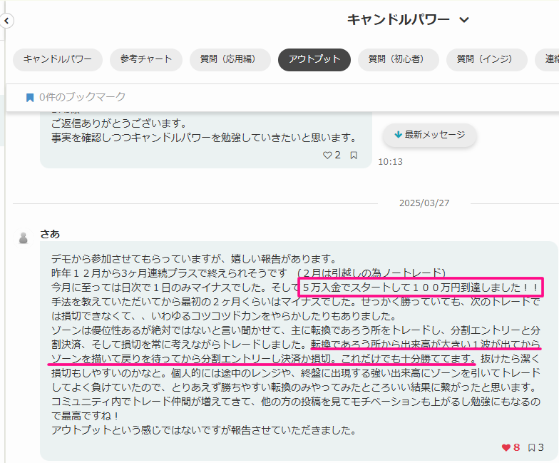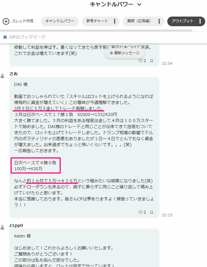 コミュニティーがあるのはいいですね。やはりトレードは孤独なので、同じ手法を試行錯誤しながら他の人達もやってるんだなと感じられるだけで自分も頑張ろうと思えました。より多くの人が議論を交わすことになれば、もっといいアイデアも出てくるのではないかと思います。