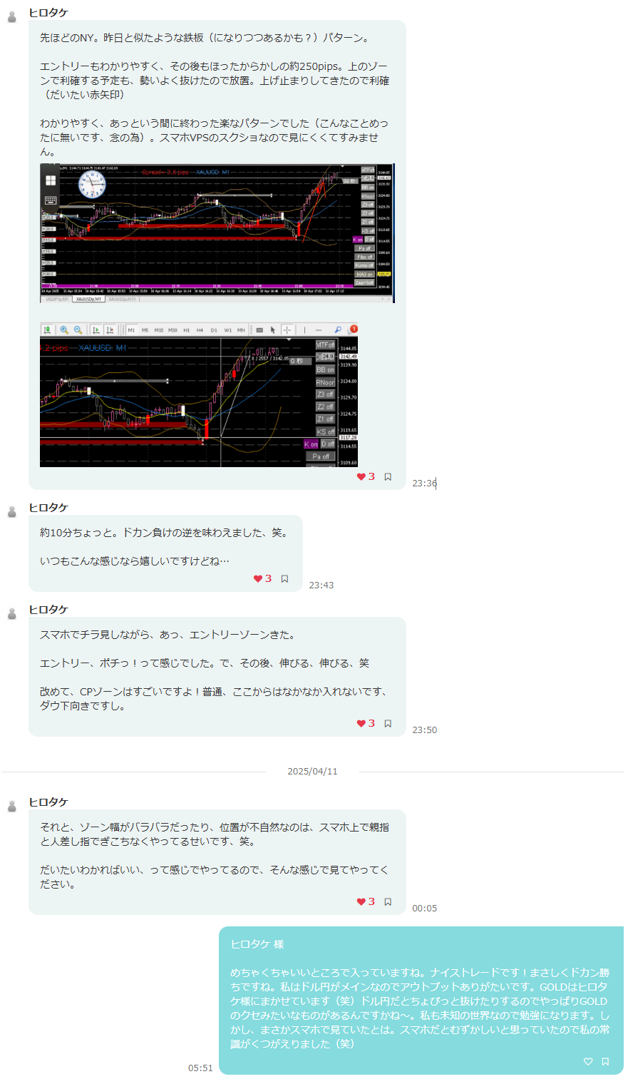 今までデイトレ(短いスウィング)のみだったのですが、難しいと思っていたスキャルピングの楽しさを実体験でき本当に感謝しています。今はドル円に加えゴールドとの2チャートで見ています。私の性格的にはゴールドがあっている気がしています。今までは低ロットでしたが、2月からは2倍ぐらい上げていくつもりです。引き続きいろいろ教えてください、宜しくお願い致します。