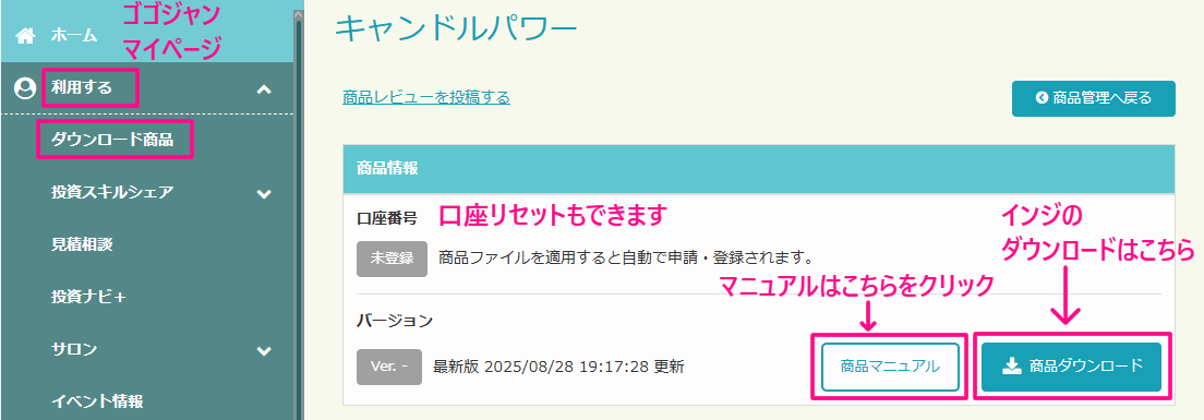 マニュアルはそのままクリックすると見れます。 インジはクリックするとダウンロードできます。