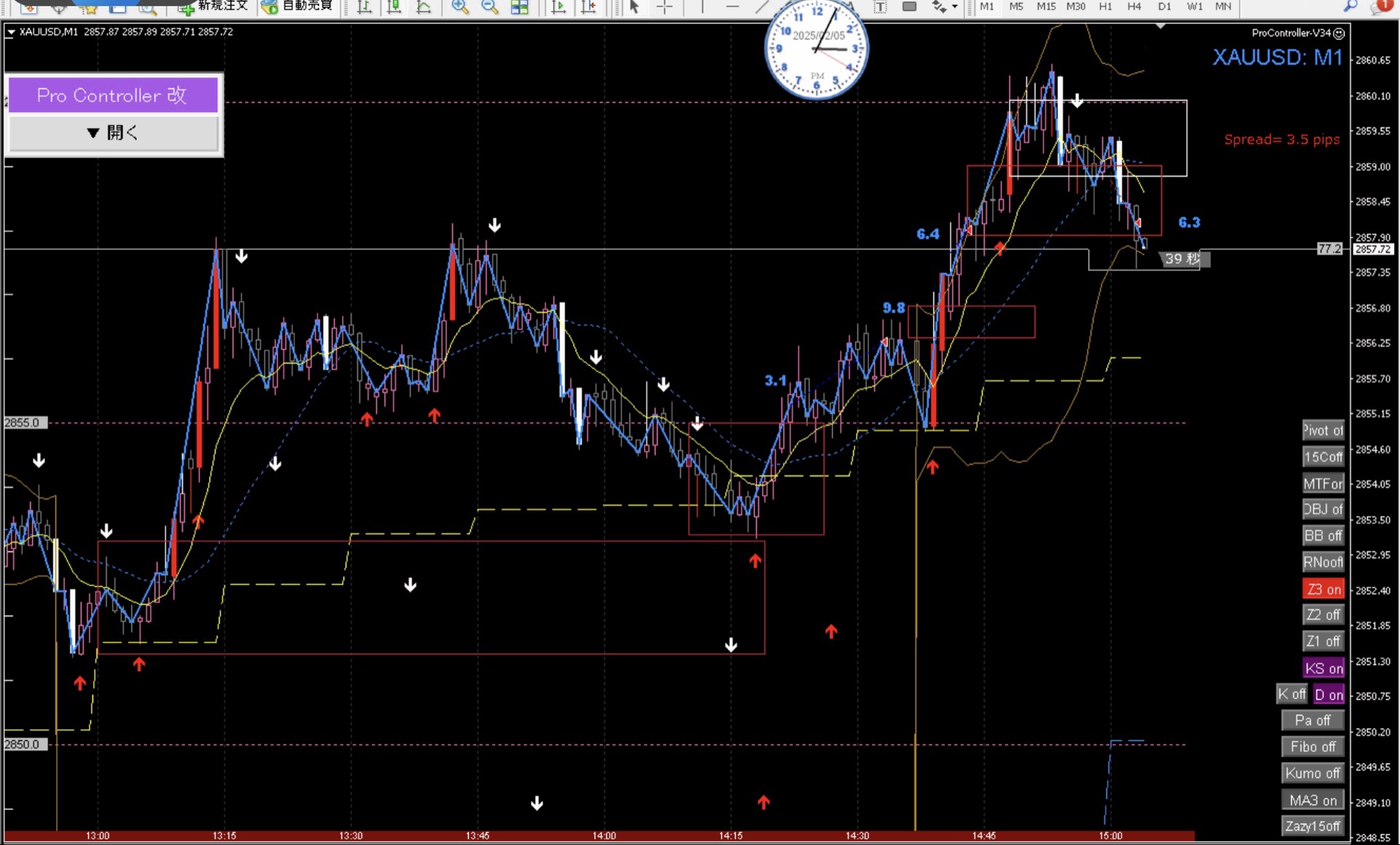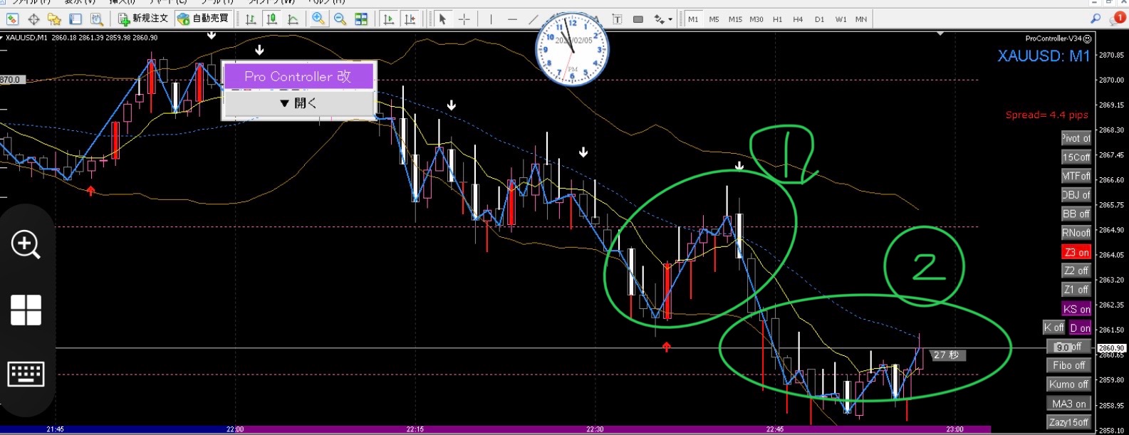 まだ教材の学習途中なので統計的なデータはご報告できませんが、値幅が期待でき長ヒゲのローソク足が出現しやすいGOLDは、このスキャル手法に適しているように感じました。例えば、ロンドン市場オープン後の時間帯で、レンジブレイクからイケイケ!どんどん!の上昇トレンド中に出現する陰線コマ足からのゾーンは反発しやすいようですし、狙う値幅によって欲張らない決済と分割決済を使い分けていくと良い結果が積み重ねられそうです。