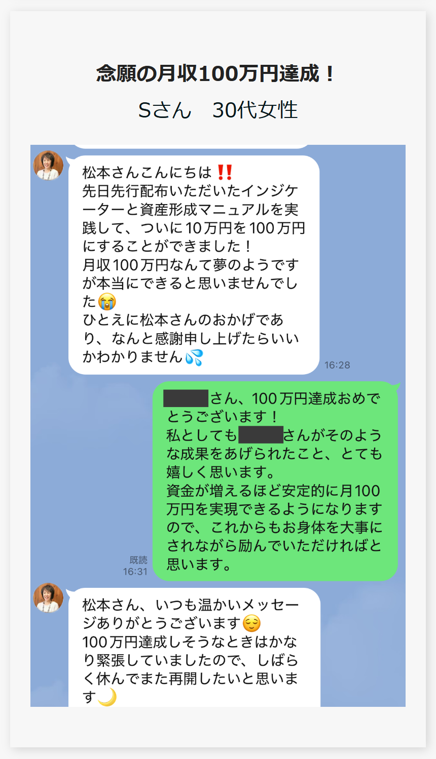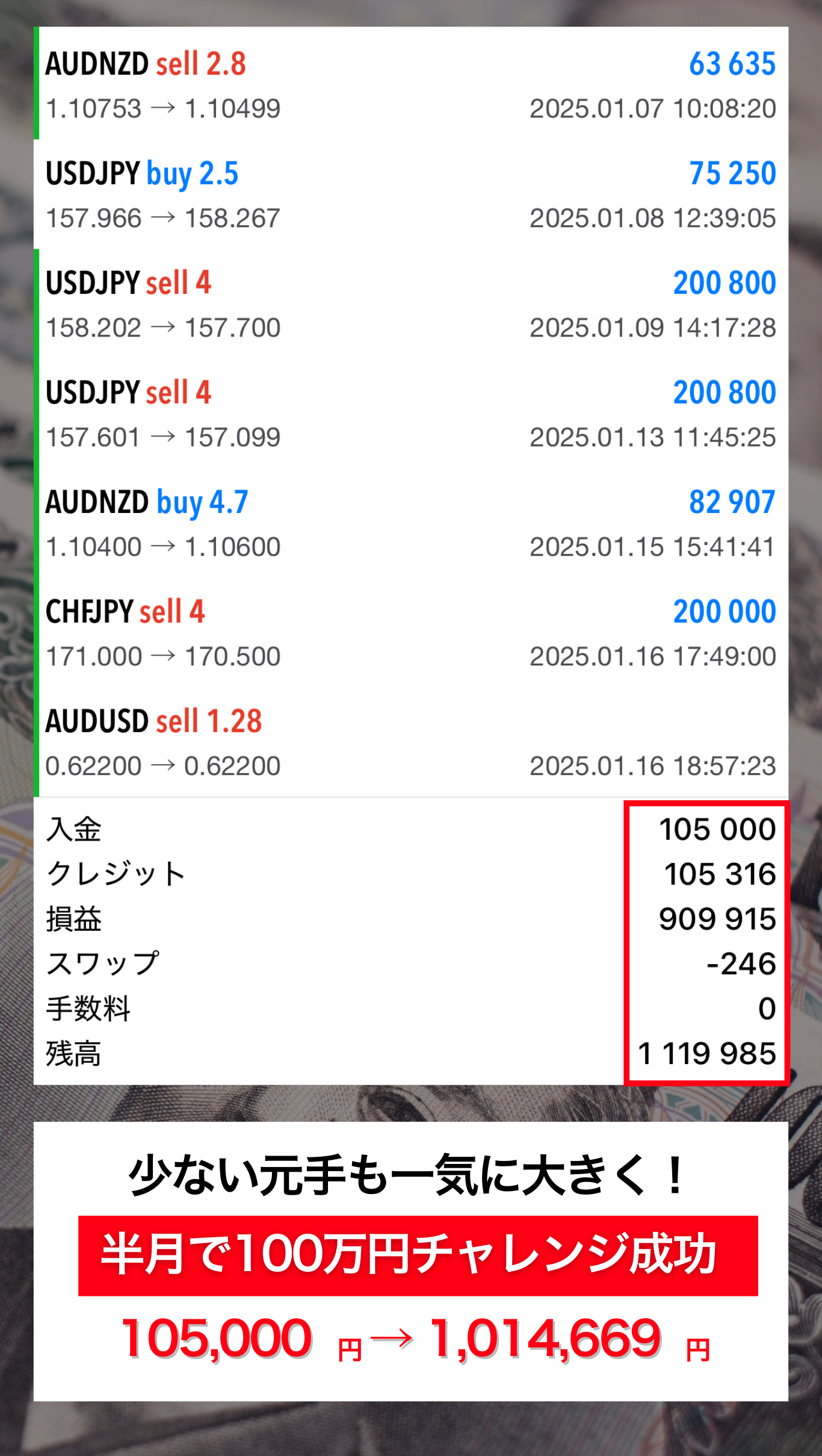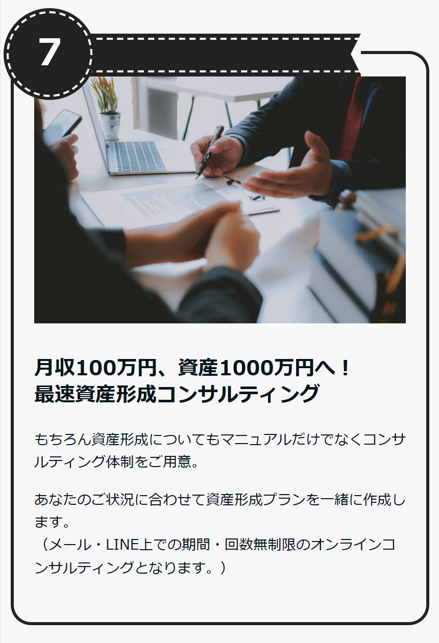 特典の資産形成マニュアルや私のコンサルティング通りにトレードすることで、元手10万円未満から、早くて1ヶ月で月収100万円や、資産1,000万円以上を目指すこともできます。