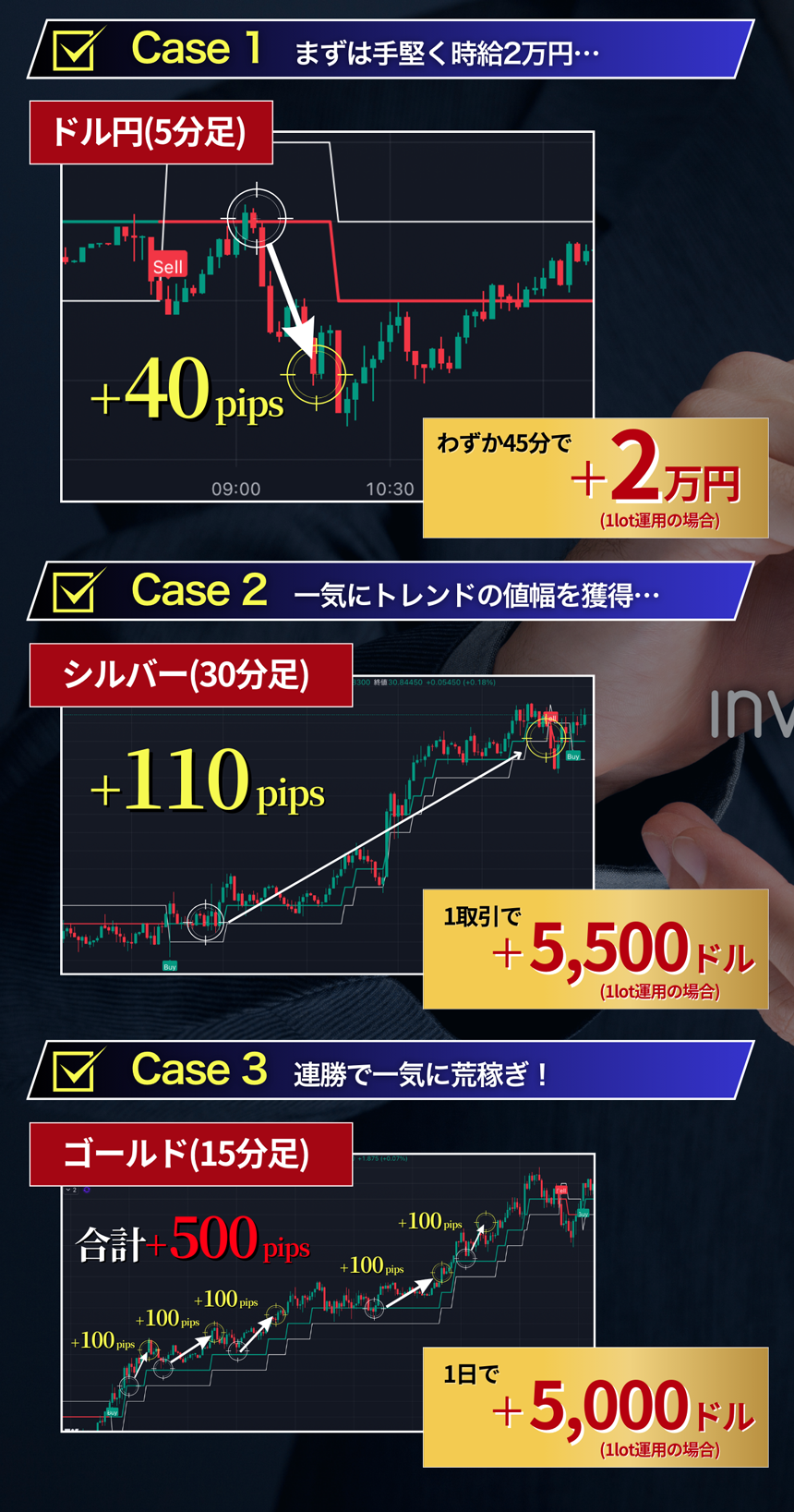 月利10~30%、初心者も高い再現性、最短1ヶ月で月収100万円、デイトレード完結型インジケーター