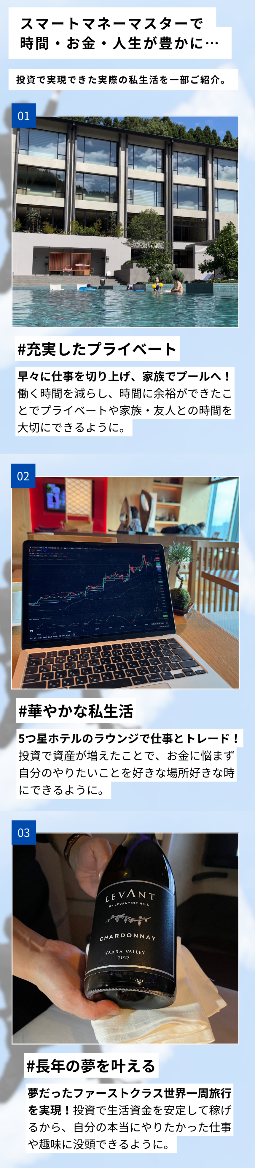もしご購入・ご参加いただけたなら、これまでの働き方やトレードスタイル、資産含めてあなたの生活は参加前から劇的に変化するでしょう。