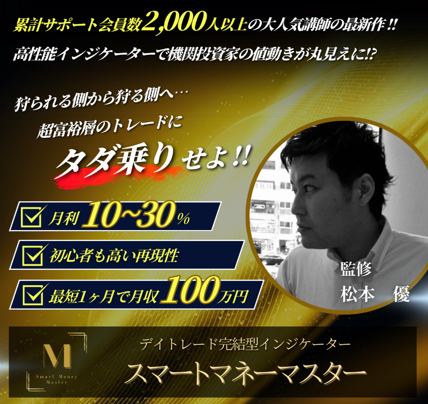 今回のスマートマネーマスターについても、 多くのトレーダーが機関投資家のトレードにタダ乗りして トレード勝率7割、平均月利10~30%もの高勝率・高収益を狙える自信作です。