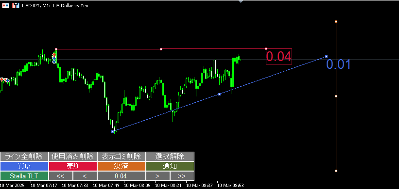 買い、売りのラインを引いた後、手動でラインのみを削除するとロット表示だけが画面に取り残されてしまうことがあります。