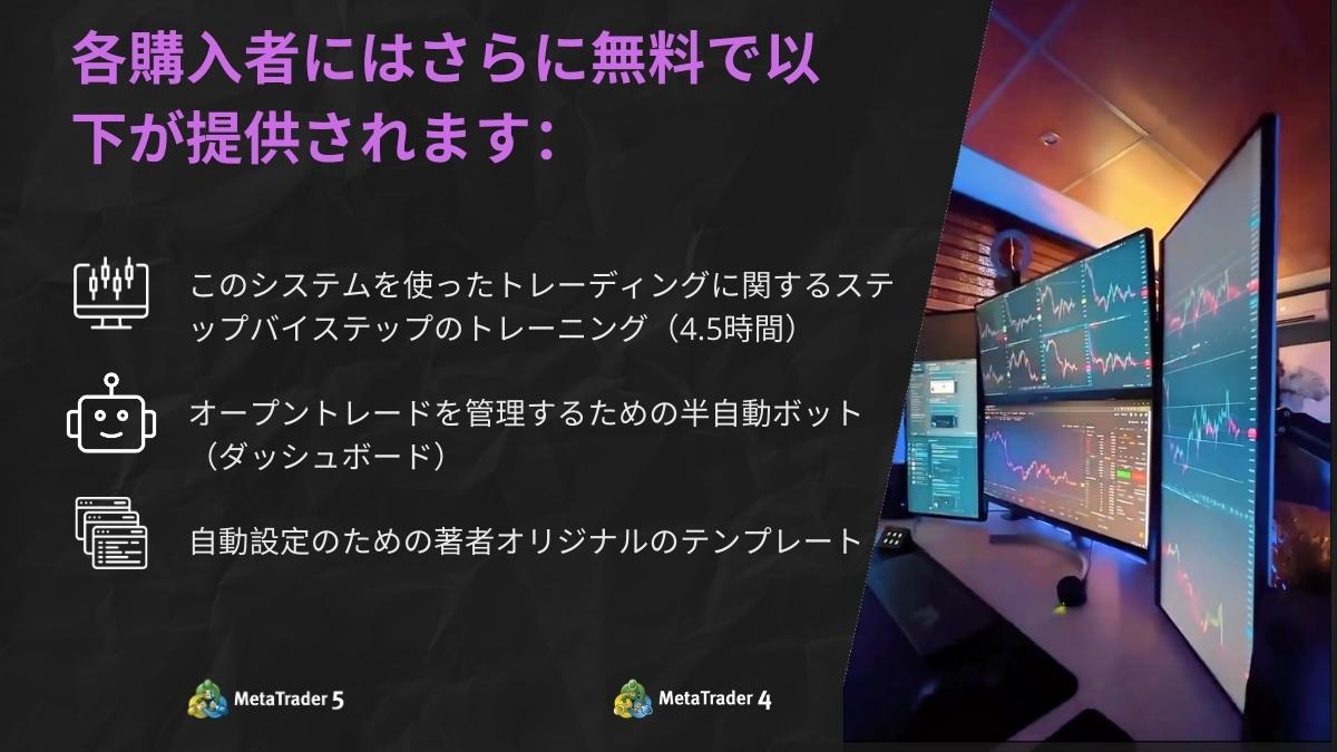 あなたのトレードを安定した利益獲得システムへと変貌させます。単なるアシスタントではなく、高度なアルゴリズムを搭載した完全なトレードソリューションです。自信を持って稼げる未来を、今ここから。