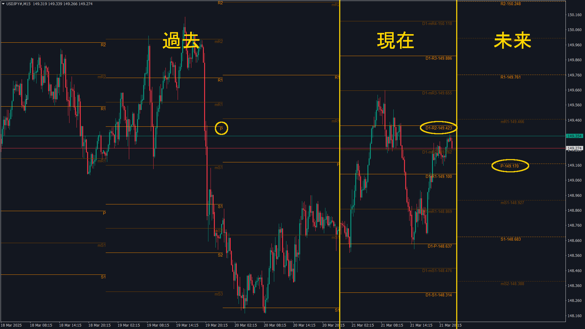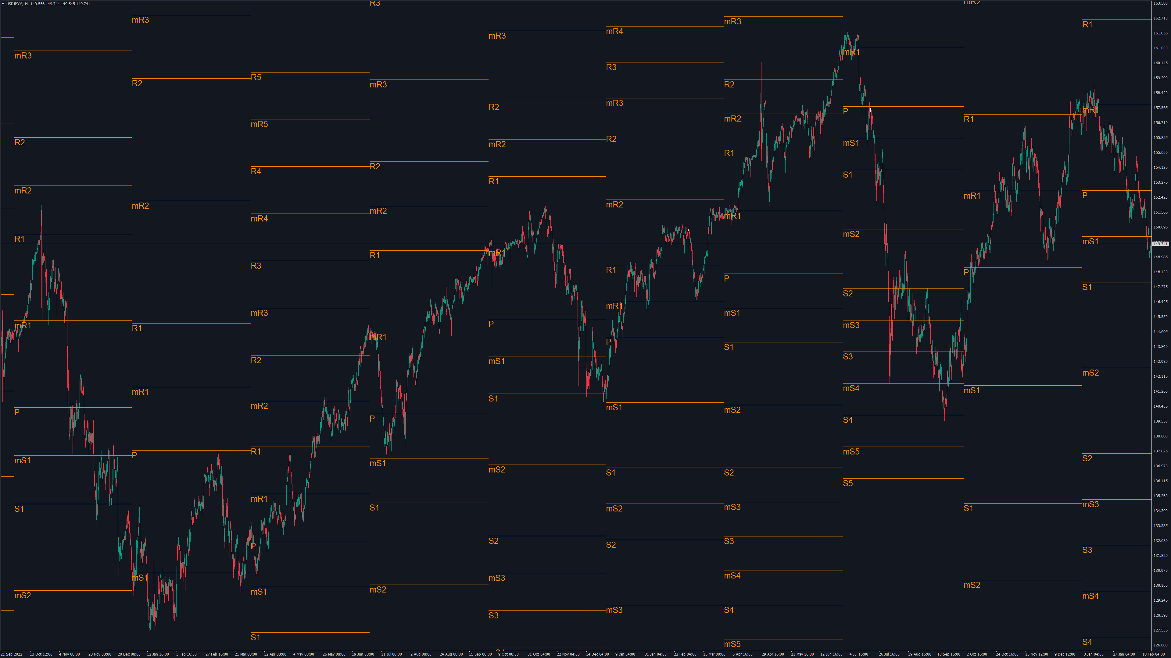 日本時間(※標準時間時)の5時、8時、17時、22時(MT4時間で、22時、1時、10時、15時)を開始時間として区切ったピボットポイントの例です。