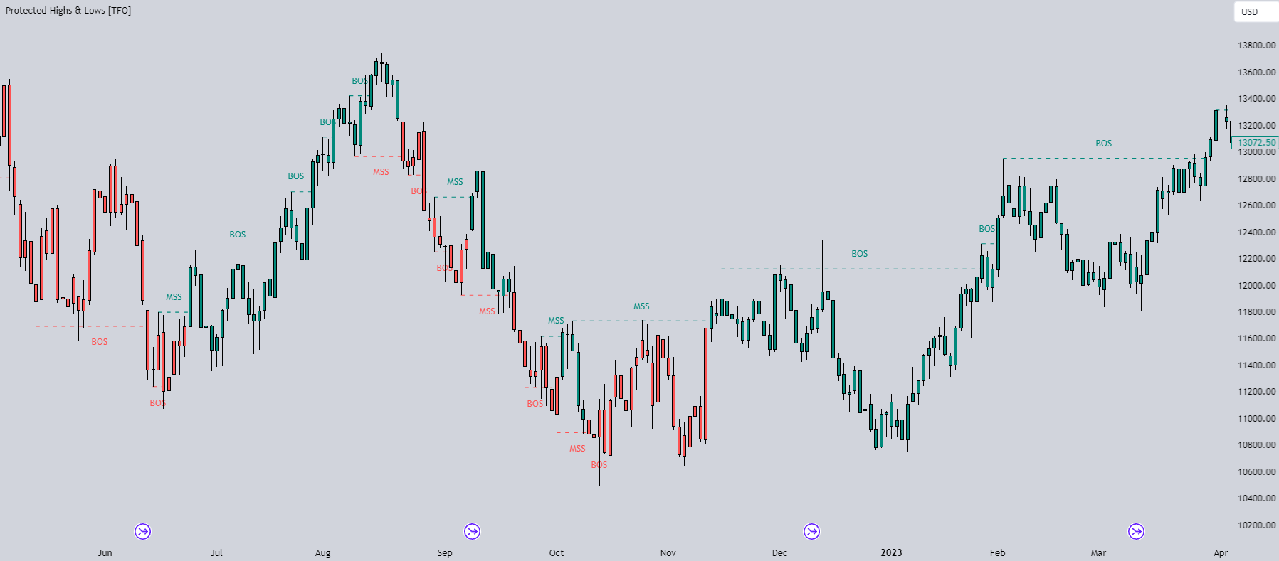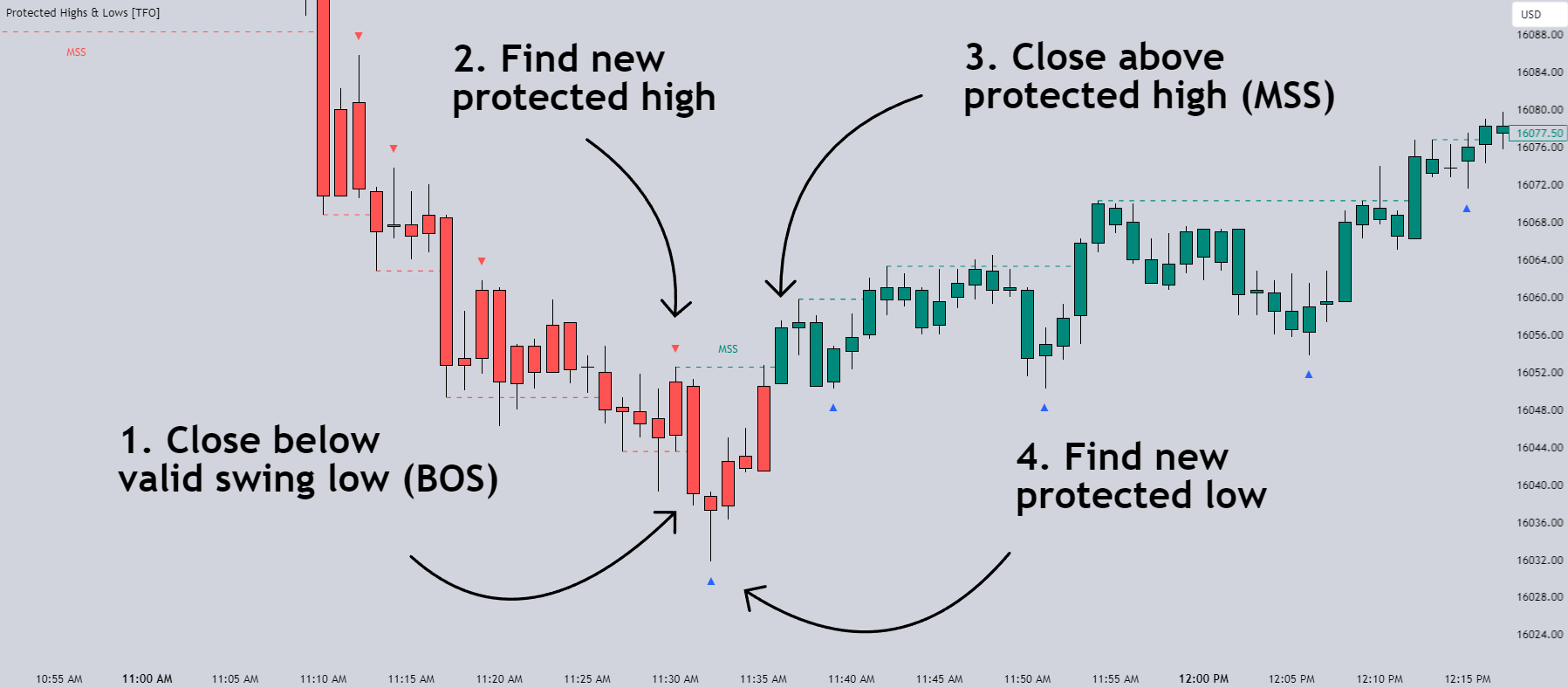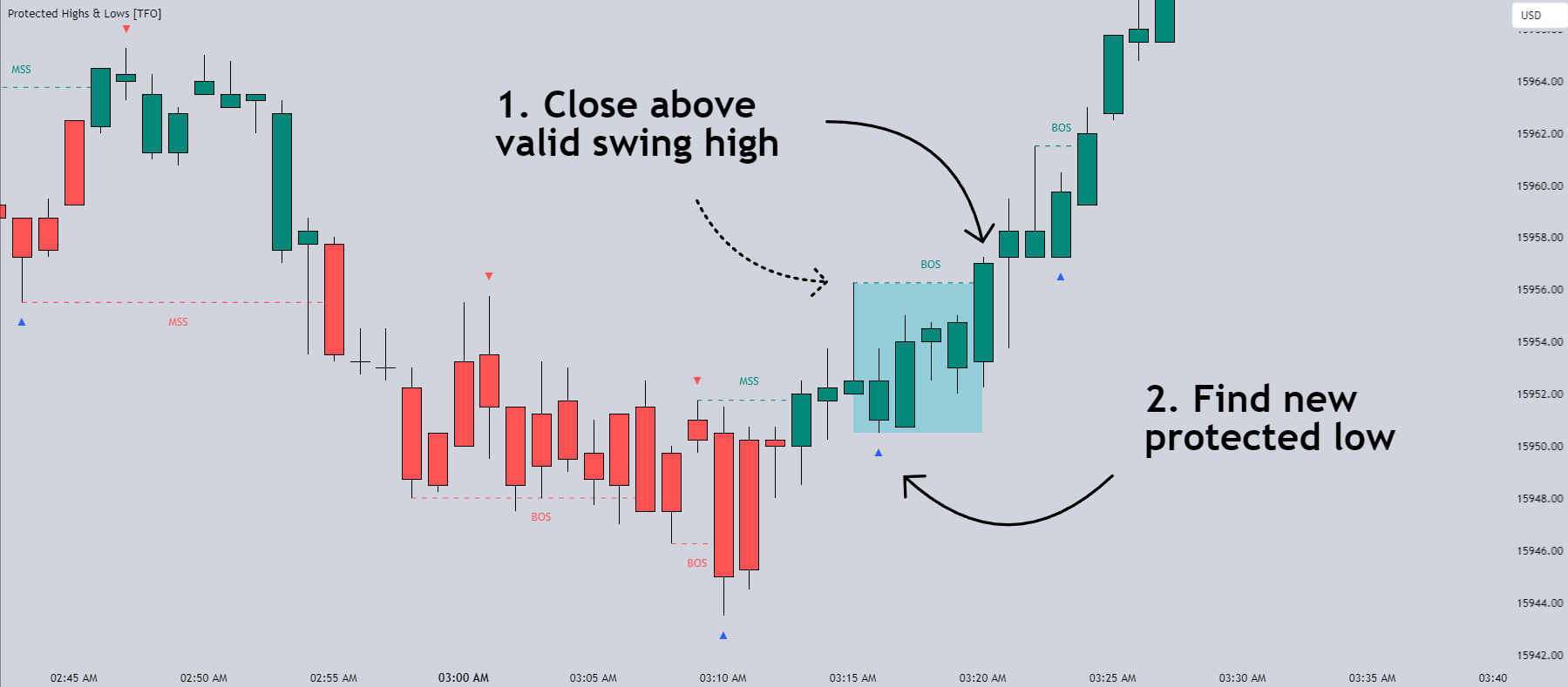 MSSを特定する際: 現在のトレンドが弱気で、強気の反転を探している場合、価格は最新の保護された高値の上でクローズする必要があります。これが発生すると、私たちはまだその範囲内で作成された最低の安値を探し、それを新しい保護された安値とします。同様に、弱気の反転を探している場合、価格は最新の保護された安値の下でクローズする必要があり、その結果、新しい保護された高値(その範囲内の最高点)が得られます。