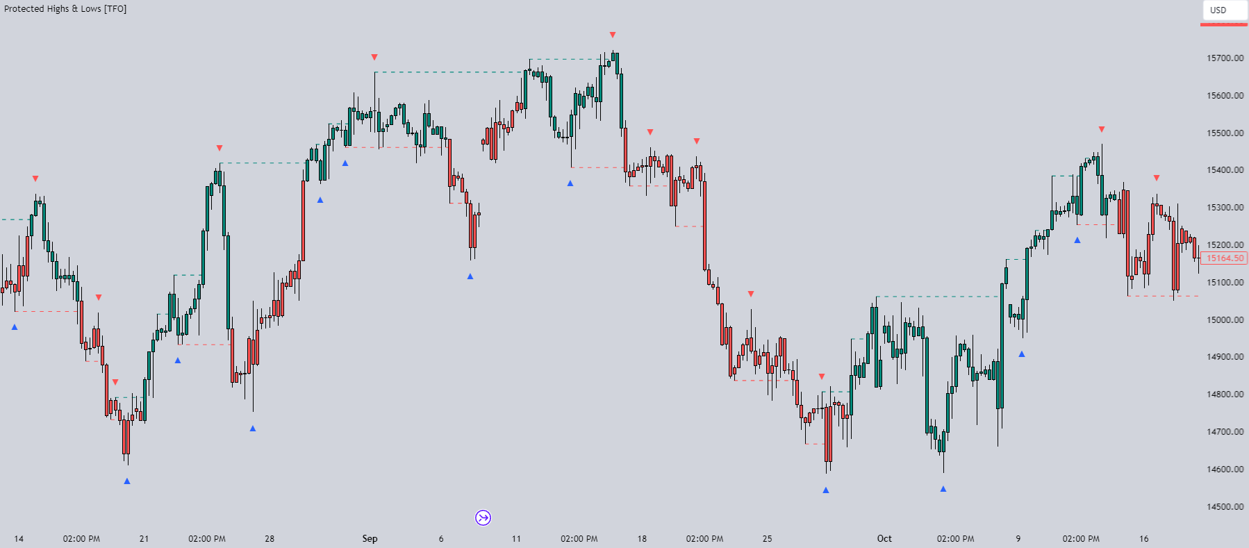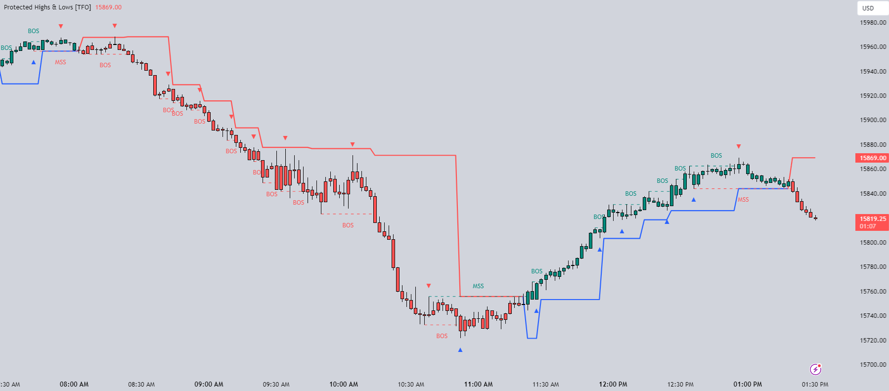 市場構造を定量化する際には、フラクタルの高値と安値を使用して「重要な」スイングピボットを特定することが一般的です。価格がこれらのピボットを通過してクローズすると、反転のための市場構造のシフト(MSS)または継続のための構造のブレイク(BOS)を特定することができます。この「保護された」論理の主な違いは、有効なMSSまたはBOSを特定するために使用されるピボット/レベルを決定する方法にあります。