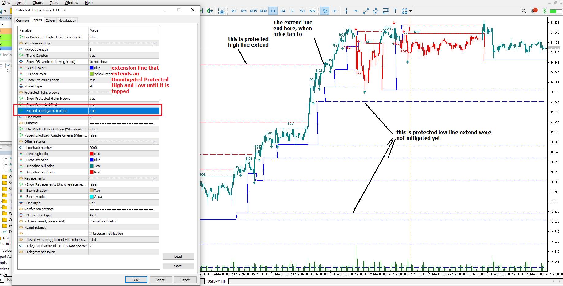 2. タップされるまで、緩和されていない保護された高値と安値を延長する拡張ラインによる機能を追加