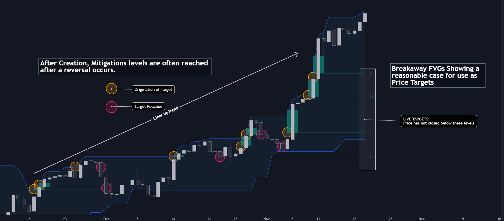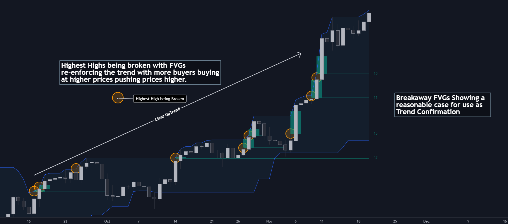 理論的には、ブレイクアウェイFVGは一般的に市場参加の良い指標であり、FVGの突破方向に好意を示します。これは、買い手または売り手が市場を迅速に押し上げることの組み合わせです。 すでに 最近の歴史における最高値または最低値に達している状態で。