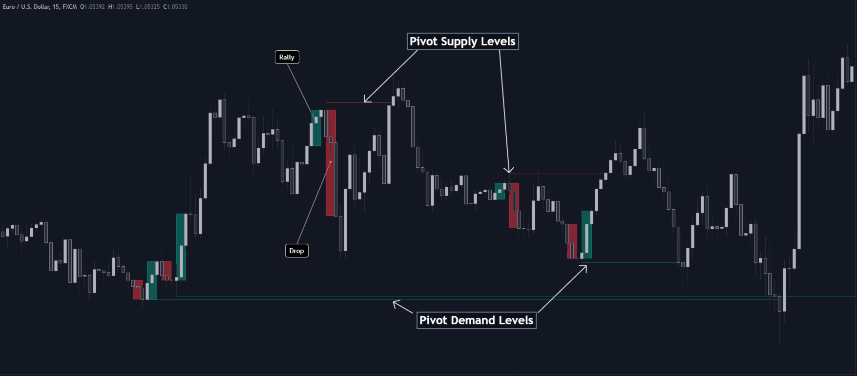 Rally Base Drop SND Pivotsインジケーターは、「Rally」、「Base」、および「Drop」キャンドルを使用して、供給と需要(SND)レベルが描かれるピボットポイントを決定します。(図1)