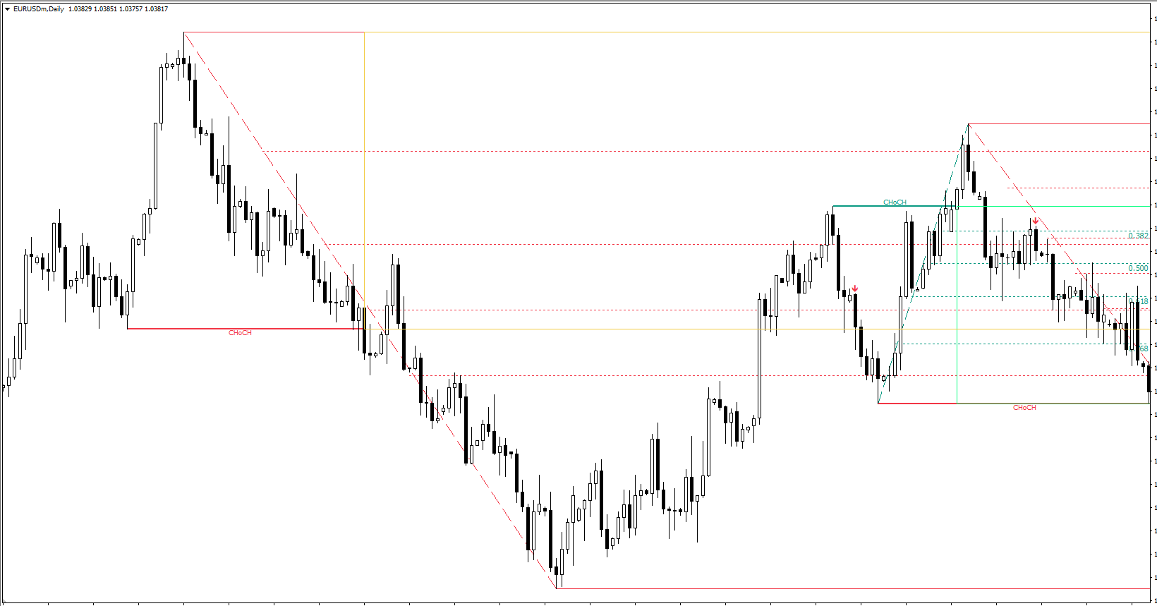 AOI内で新しいスイングハイまたはローが出現すると、ツールは自動的にフィボナッチリトレースメントレベルを適用して潜在的なリトレースメントゾーンを示します。このセットアップにより、トレーダーは価格のプルバックが発生する可能性のあるエリアを特定し、潜在的なエントリーや反転に関する実用的な洞察を提供します。