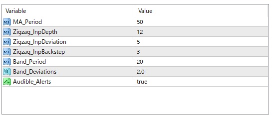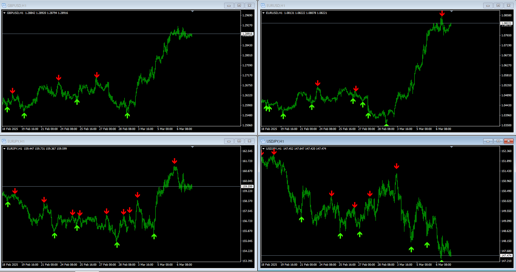 1. 概要 Zigzag_Band_Arrow(MT5)は、ZigZag・ボリンジャーバンド(BB)・移動平均(MA50)を組み合わせた売買シグナルインジケータです。 相場のトレンド転換を識別し、エントリータイミングを明確に示します。 2. 主な機能 • ZigZag を使用してトレンド転換点を特定。 • ボリンジャーバンド(BB) の上限・下限で価格の過熱感を測定。 • 50期間移動平均線(MA50) で大局のトレンドを把握。 • 売買シグナル時に 矢印を表示。 3. 使い方 1. MT5の「ナビゲーター」ウィンドウで Zigzag_Band_Arrow を選択。 2. チャートにドラッグ&ドロップ。 3. パラメータを設定し、適用。 4. チャート上に 売買シグナルの矢印 が表示されます。 4. 推奨設定 • ZigZag : デフォルト設定(Depth:12, Deviation:5, Backstep:3) • ボリンジャーバンド : 期間20、標準偏差2.0 • 移動平均線(MA50) : 50期間のSMA 5. 売買シグナルのルール • 買いシグナル o ZigZagの安値形成 o 価格がボリンジャーバンドの下限付近 o 50MAの上で推移 • 売りシグナル o ZigZagの高値形成 o 価格がボリンジャーバンドの上限付近 o 50MAの下で推移