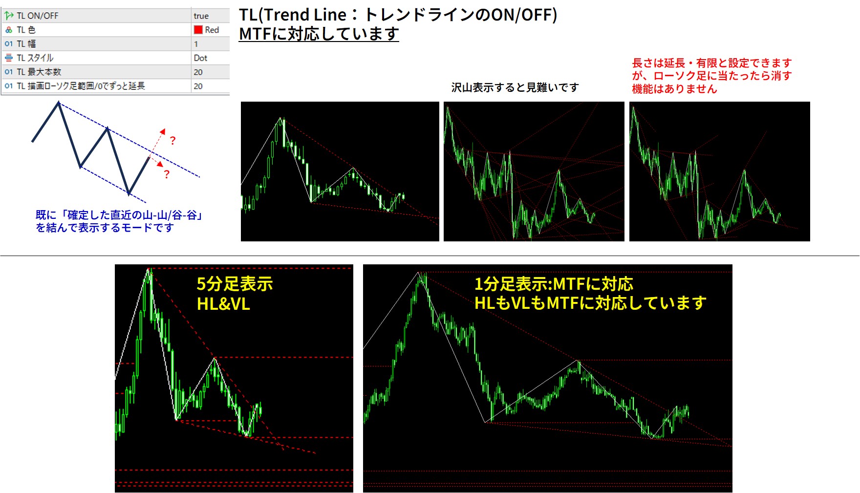 既に確定した直近の山-山/谷-谷を結んだときに描けるトレンドラインを描画することができます(ミニトレンドライン)。ラインをどこまで伸ばすかの設定が可能です。こちらは、水平線と異なって、ローソク足に当たった場合の描画を止める機能はありません。HLと同じく、MTFに対応しています。ジグザグのピークがCloseModeだと、ヒゲではなく実体からのトレンドラインになります。