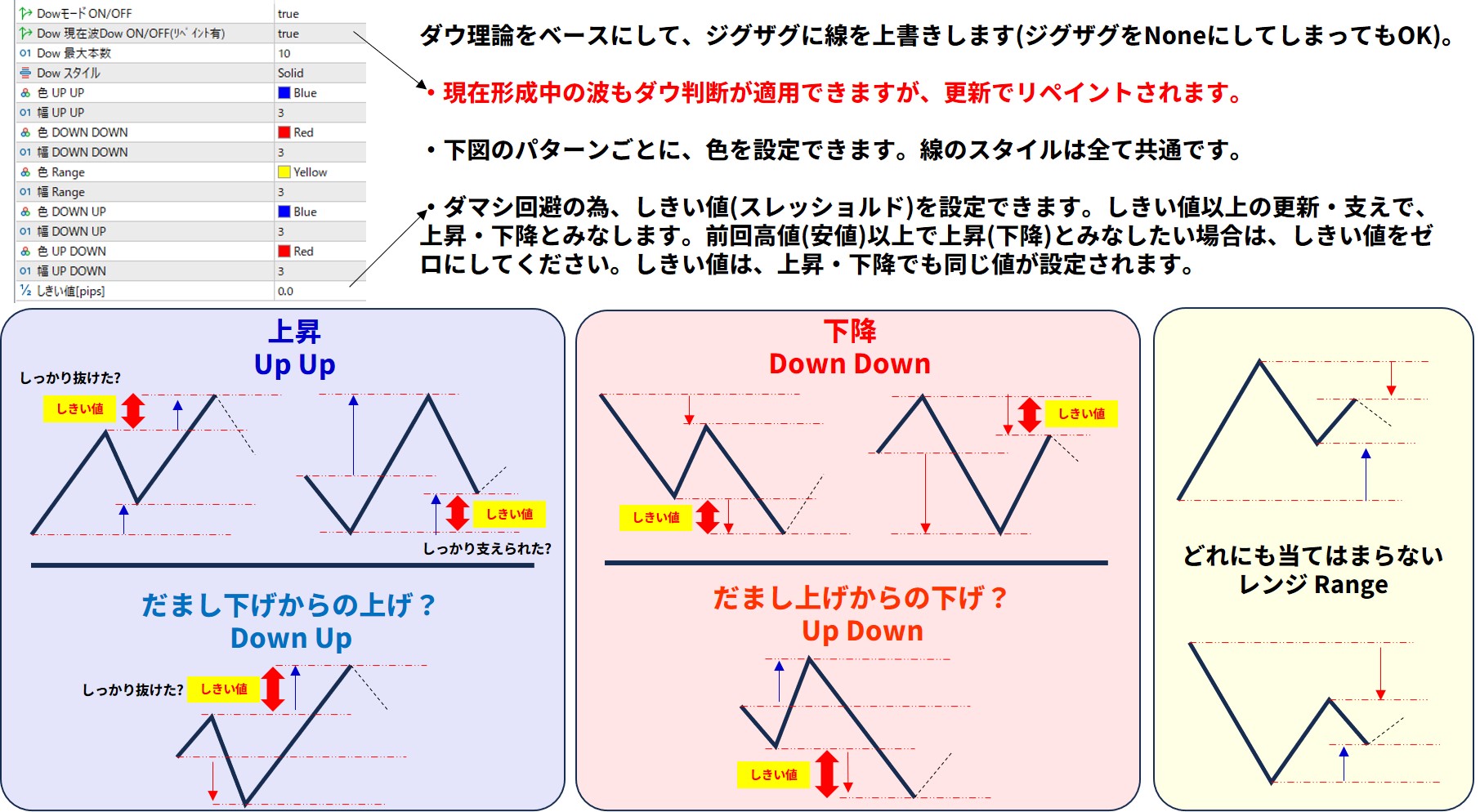 - ダウ理論描画モードについて、直近の波形は確定するまで描画を止めたい場合は、OFFにしてください。